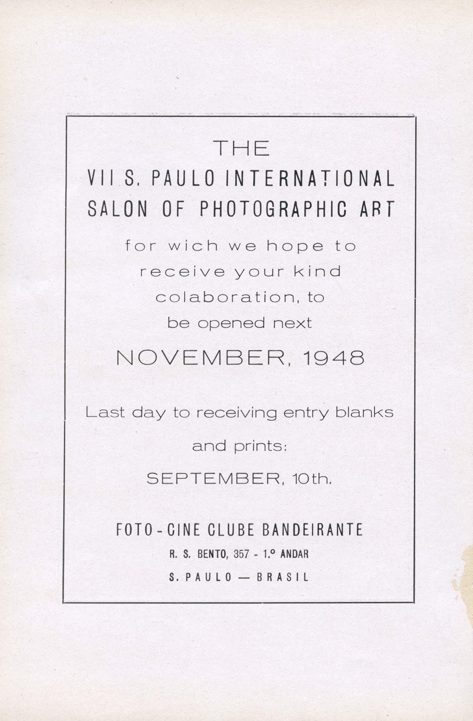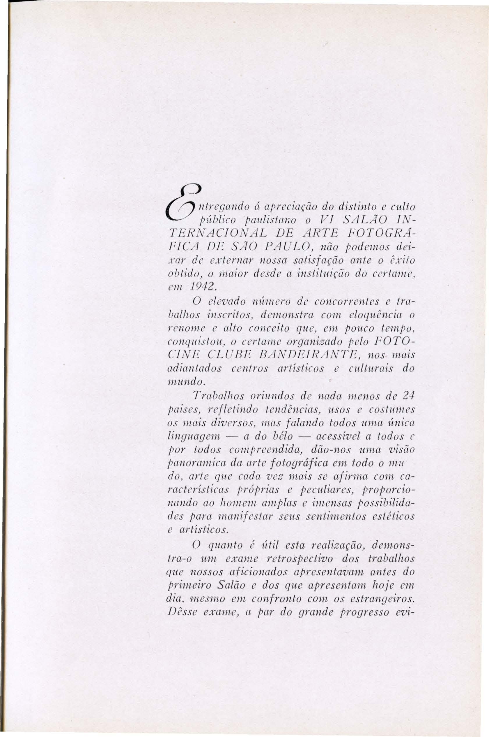 J? ztregando á apraiação do distinto e rulto u ~zíúlico pa1tlista1;0 o VI SALA.O INTERN AC JON AL DE A RTE FOTOGRAFTCA ])E SÃO PAULO, não podemos d eixar de ex t ernar nossa satisfação ante o é.rifo obtido, o 111aiord esd e a instituição do arta111C', (' Ili ]942.