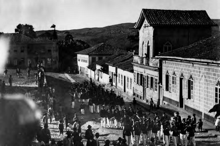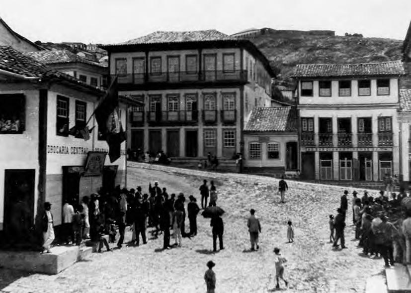Cenas de uma procissão passando pelos arredores da Rua da Grupiara. Ao fundo, o Mercado e a Igreja de N. Sra. do Amparo.