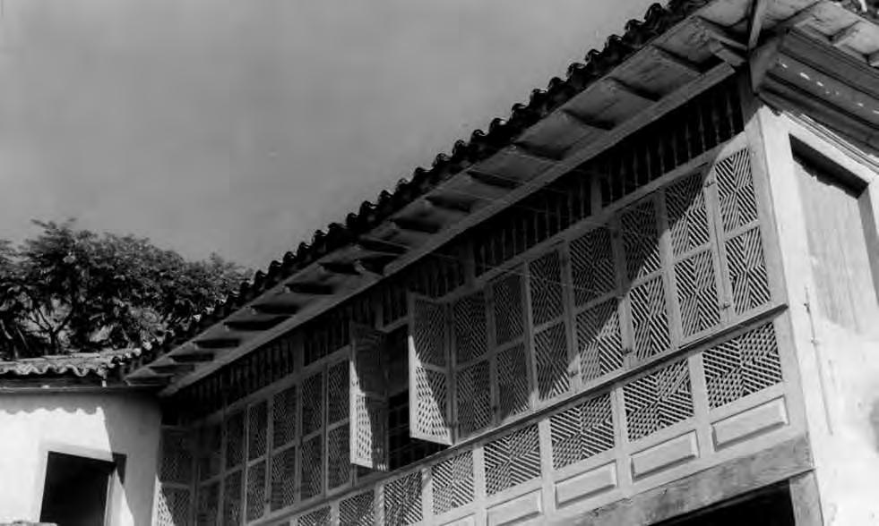 Casa na Rua da Quitanda. O aspecto xadrez das gelosias (treliças) no primeiro pavimento deve-se ao arranjo e orientação das ripas de madeira.