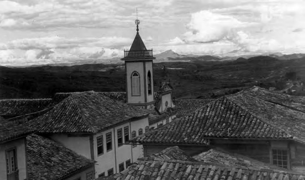 Panorama da cidade de Diamantina. Em primeiro plano, os fundos da Igreja de S. F. de Assis. Em destaque, a Catedral antiga. À esquerda, o Mercado e os fundos da Igreja de N. Sra. do Amparo. Ao fundo, as torres da Capela do Senhor do Bonfim e da Igreja de N. Sra. do Carmo. Fotografia: s/d.