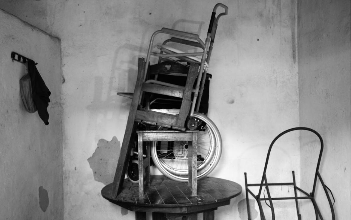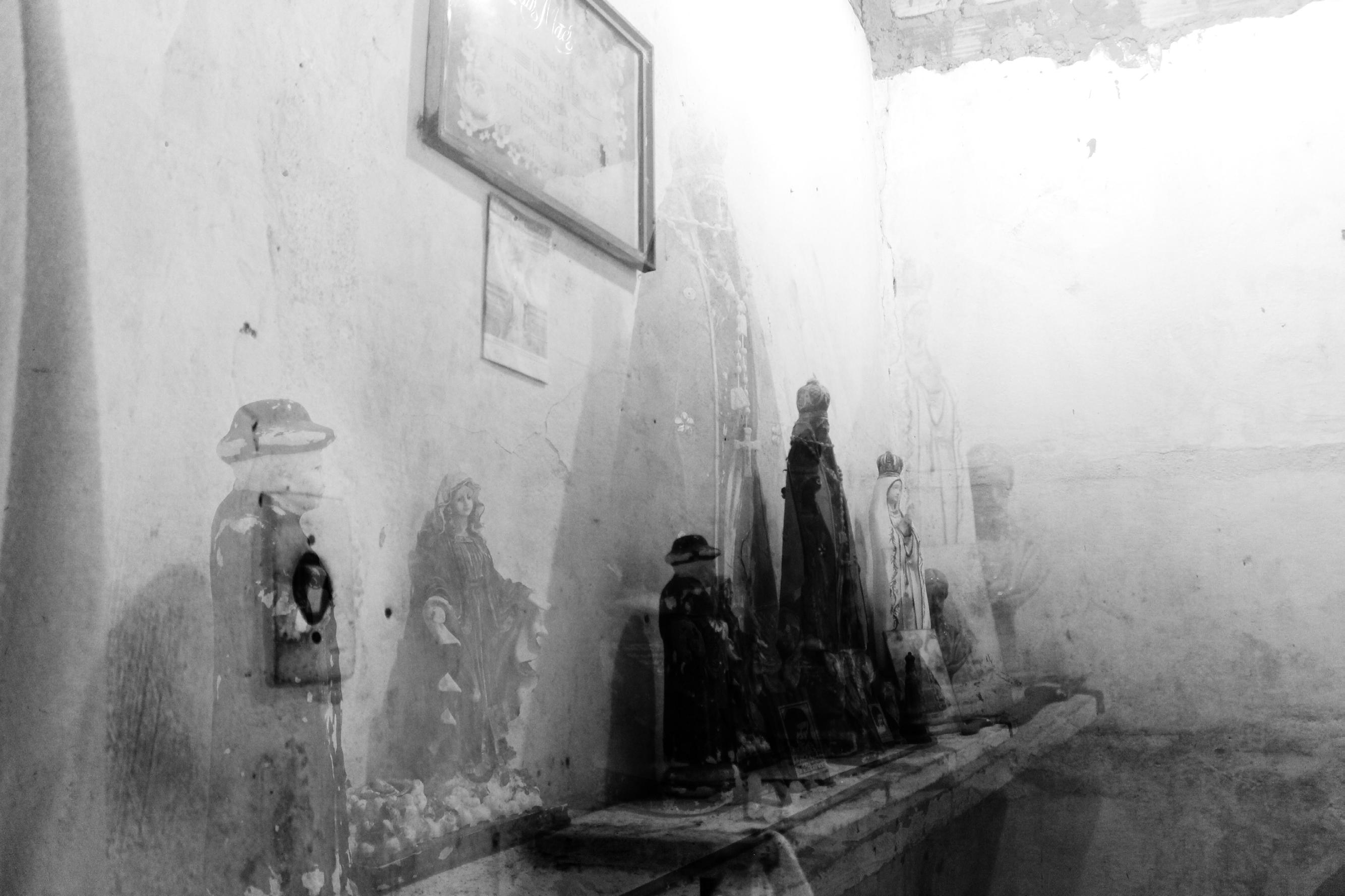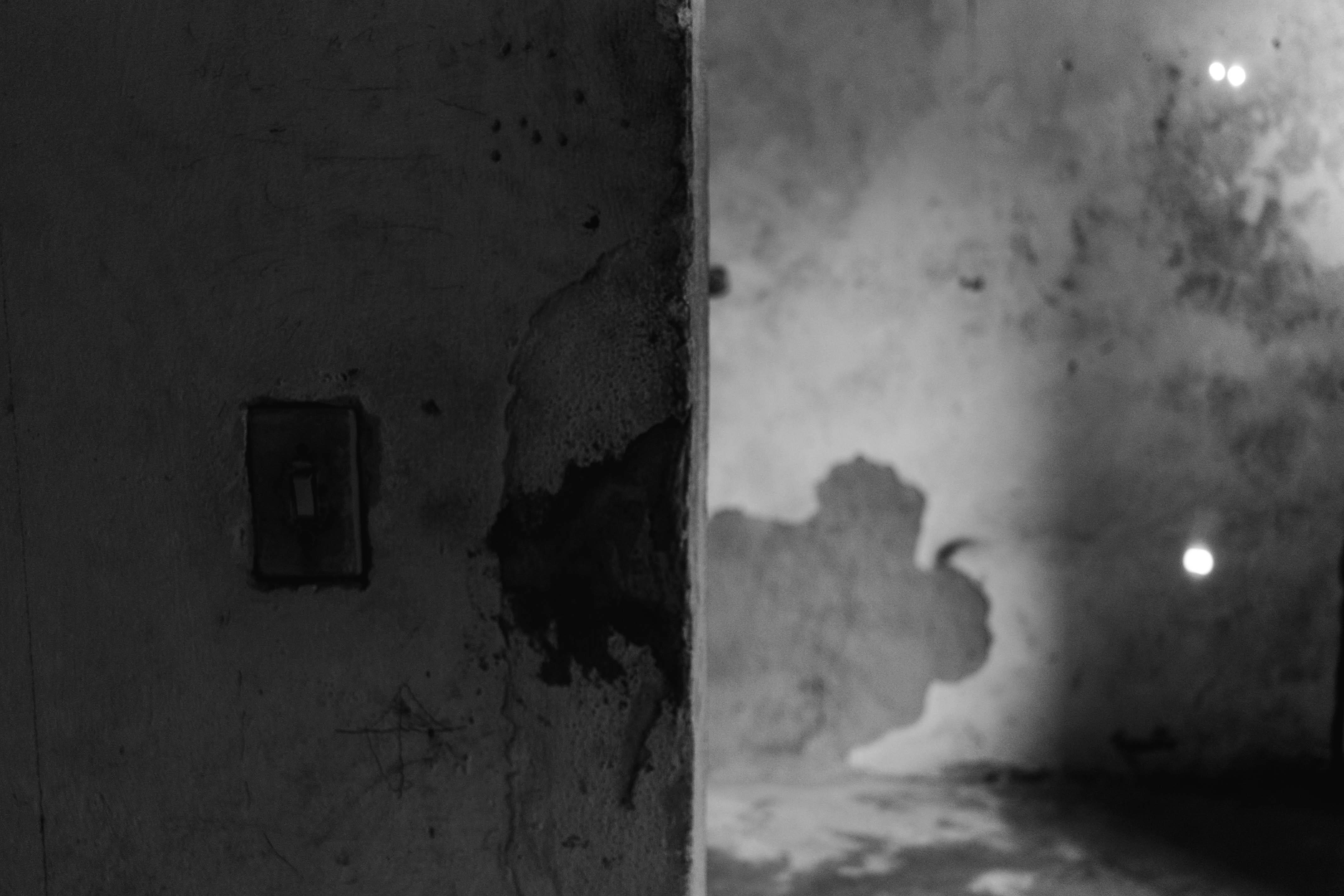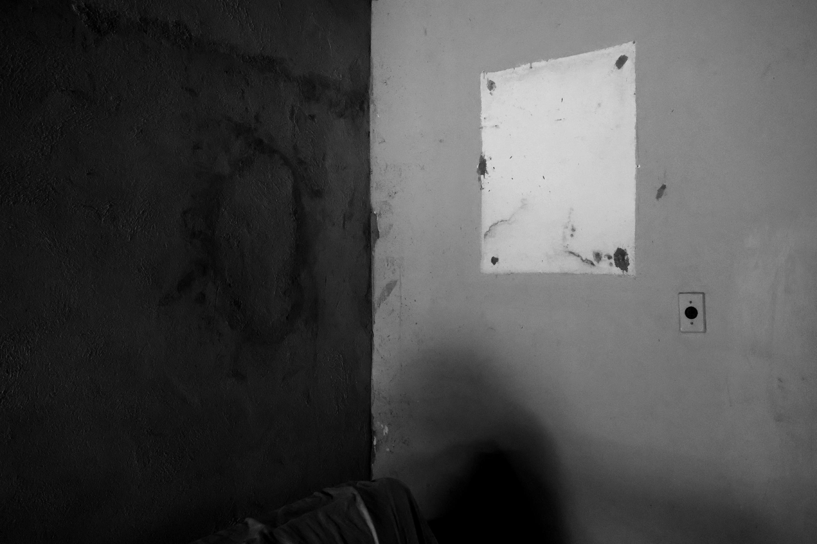 15. O quartinho, hoje demolido. Registrei essa imagem na Páscoa de 2023, a última ao lado do meu avô. Estávamos no quintal com familiares. A luz que entra pela direita marca o espaço e o que o tempo fez ali: tintas desbotadas, as rachaduras e o mofo.