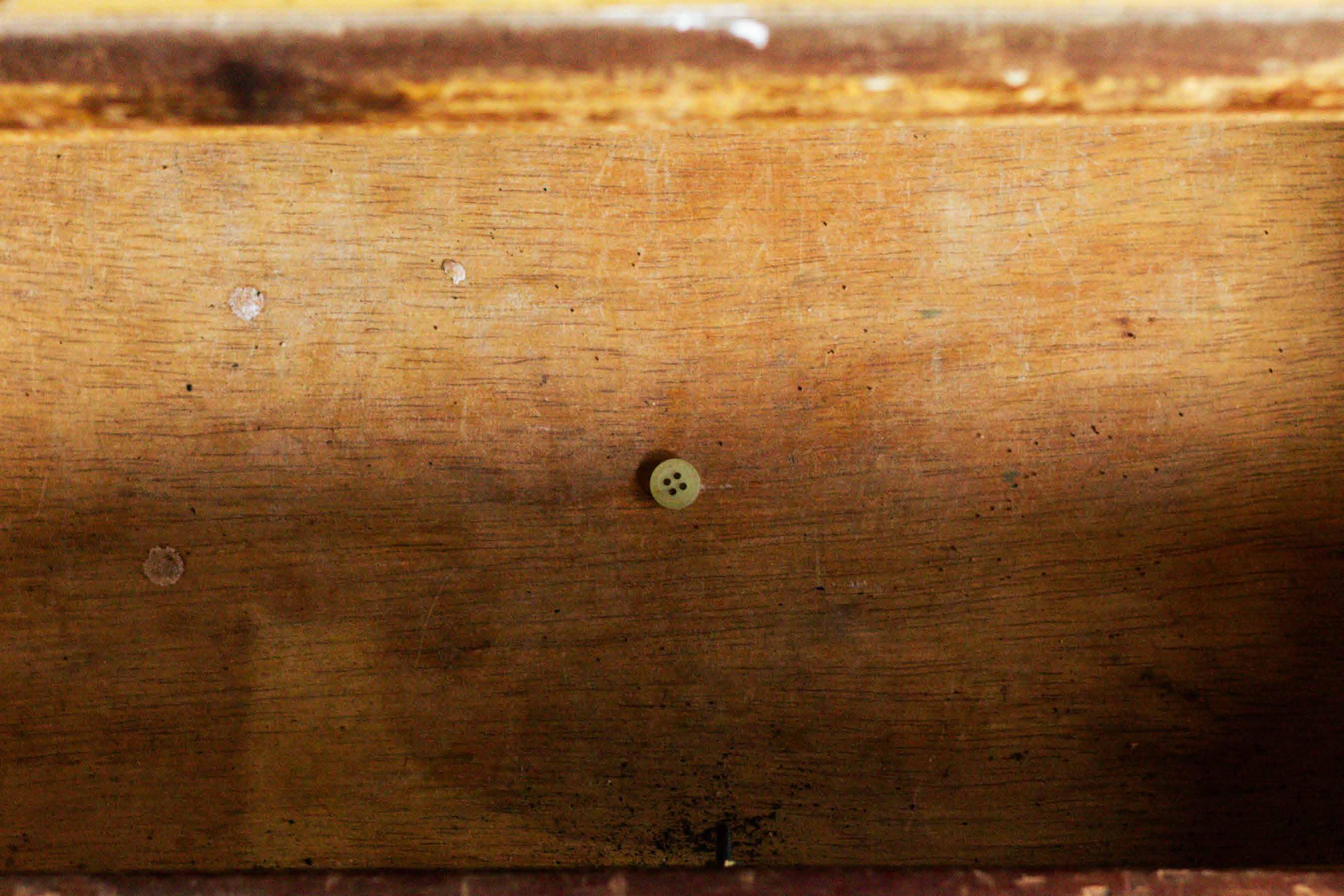 23. A última fotografia do livro é de uma gaveta. Ela fazia parte de um móvel ao lado da cama do meu avô. Quando iniciamos o processo de desmontar a casa, abrimos portas, reunimos objetos — e lembro bem desse momento. Ao abrir o pequeno móvel, encontrei um botão.