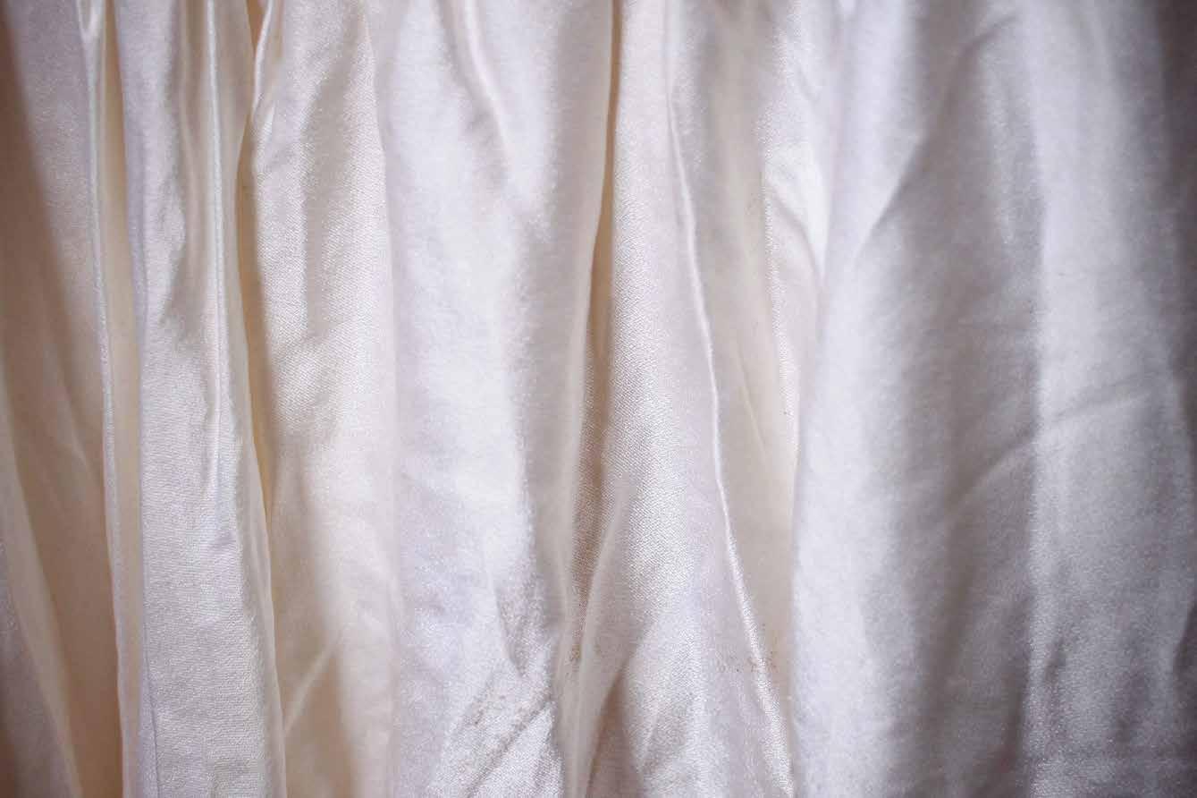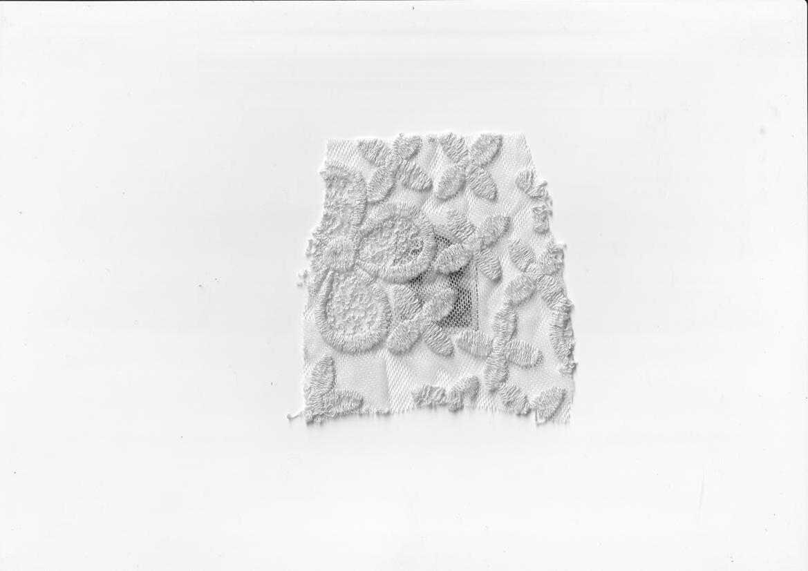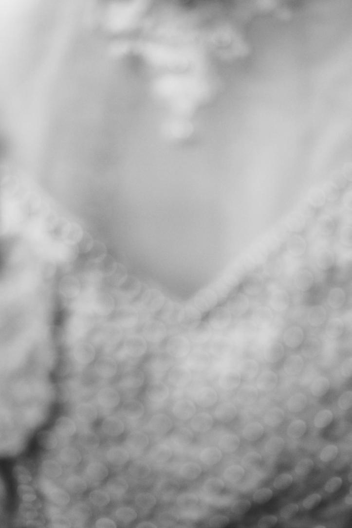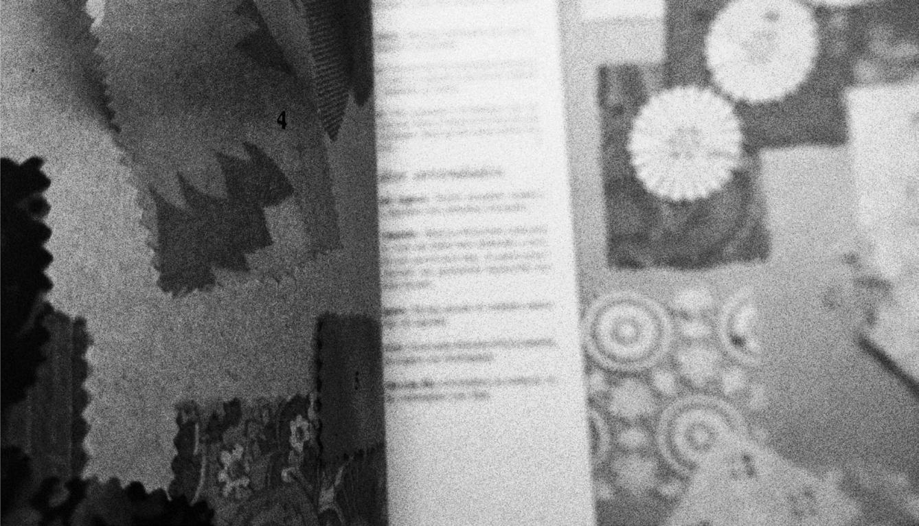 4. À esquerda, um vestido de noiva desfocado. À direita, detalhes de um tecido e a página de um livro de costura em preto e branco, com granulações visíveis na edição.