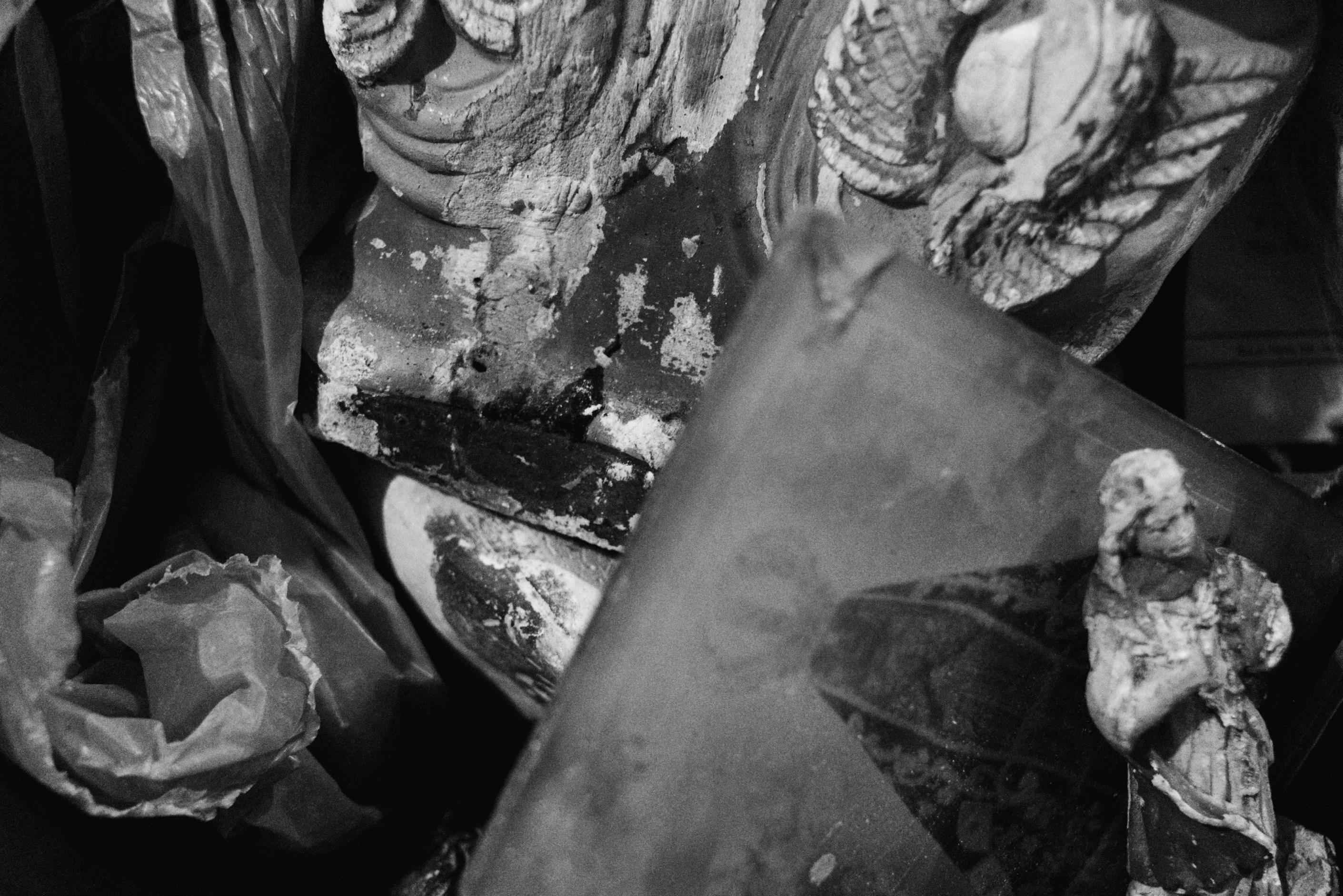 20. À esquerda, o olhar amassado de uma santa. À direita, uma dupla exposição de um altar.