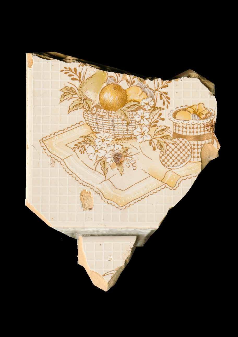 17. Paredes demolidas de um quarto sustentam rabiscos e a colagem digital de uma cerâmica que um dia decorou a casa.