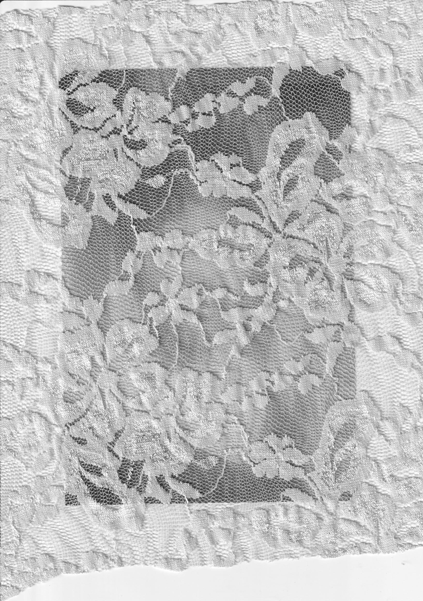 5. O rosto de uma mulher ao fundo de um tecido com rendas florais quase transparentes. À direita, a página de um livro de costura. Ao