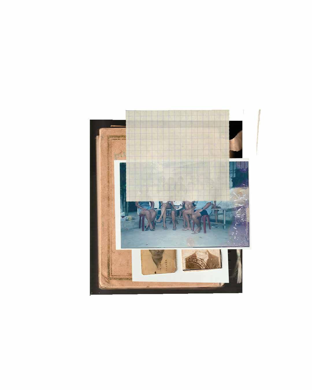 10. Uma colagem com diversas sobreposições: a capa do álbum, folhas de caderno e uma fotografia rara feita em frente à casa dosmeus avós, no início dos anos 2000. Algumas pessoas aparecem sentadas em cadeiras de plástico cor de vinho.