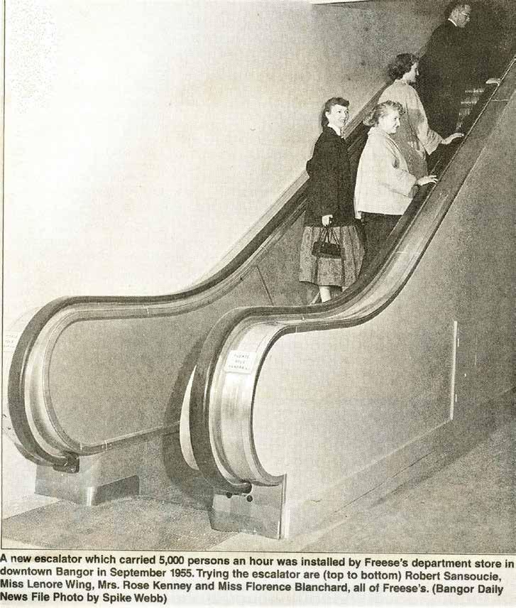 (Left) Clippings from the Bangor Daily News show holiday shoppers enjoying the new escalators at Freese’s, installed in September 1955, and Santa Claus reading from a stack of children’s letters in a 1944 advertisement promoting Freese’s toy department.
