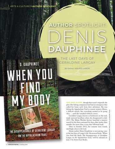 SHE WAS ALONE, though that wasn’t originally the plan. Her hiking companion had had an emergency that called her home early from their adventure. She was hiking the Appalachian Trail in remote western Maine, a difficult stretch. But everything seemed to be going okay … until she vanished without a trace. Geraldine Largay, known as Inchworm on the trail, made national headlines when she disappeared in July 2013. The Maine Warden Service launched a massive search for her that continued for days, then weeks, then months. For more than a year, they followed leads. Then in October 2015, her remains were found, startlingly close to the trail. Maine author Denis Dauphinee is now giving voice to the last days of Largay’s life. His newest book, “When You Find My Body: The Disappearance of Geraldine Largay on the Appalachian Trail,” will be released on June 1 by Down East Books. 14 / BANGOR METRO June/July 2019