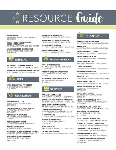 RESOURCE Guide SUMMIT FARM 3886 GRINDSTONE RD, HERSEYTOWN TWP (207) 365-4236 WILDWOODS TRAILSIDE CABINS, LODGE & RESTAURANT 125 RUSSELL RD, BROWNVILLE • (207) 965-0000 WILDERNESS EDGE CAMPGROUND BAXTER STATE PARK RD, MILLINOCKET (207) 447-8485
