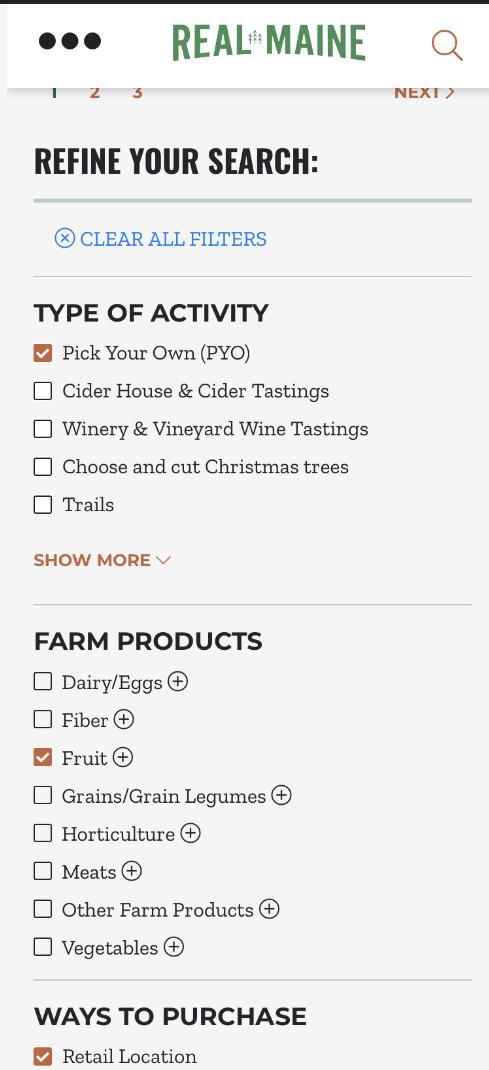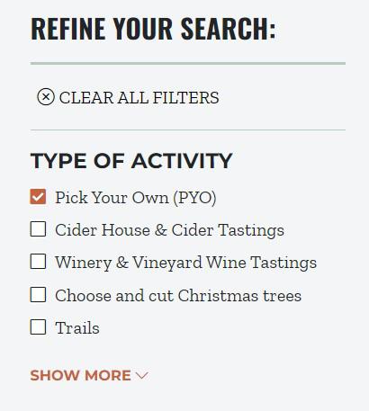 • Use the checkboxes to “Refine Your Search” by Activity (for example, PYO), Farm Products (for example, Fruit), Ways to Buy (for example, Retail, Farm Stand), etc. Locate “Refine Your Search” on the left side of a computer screen on a PC or the bottom of a mobile device screen.