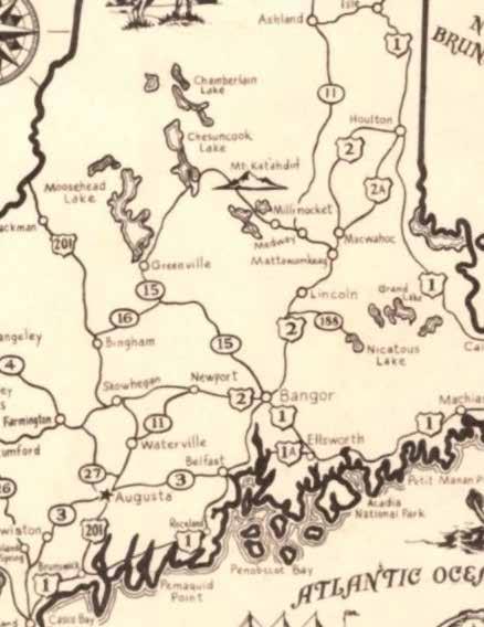(Background) Popular souvenir Maine map postcard, circa 1952.