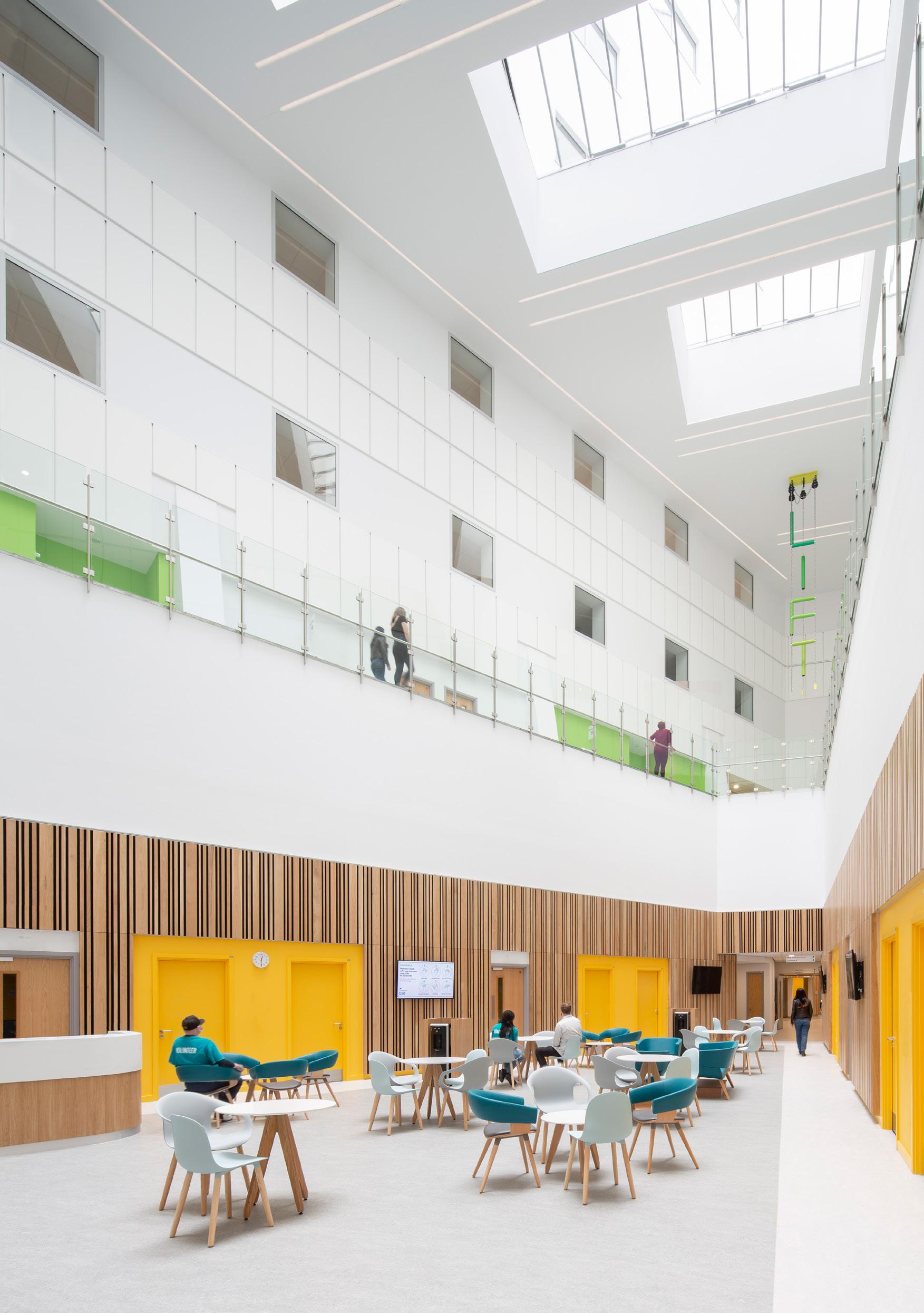 Distribuida en dos plantas, la escuela se organiza en torno a un atrio central que contiene zonas interactivas de ciencia, interpretación, música, tecnología, biblioteca, arte, narración y juego. Se ha diseñado un entorno interno intencionadamente tranquilizador para dar cabida a las diferencias sensoriales. Cuenta con un laboratorio de aprendizaje equipado con gabinetes de curiosidades, mobiliario modular y tecnología de pantalla inteligente.