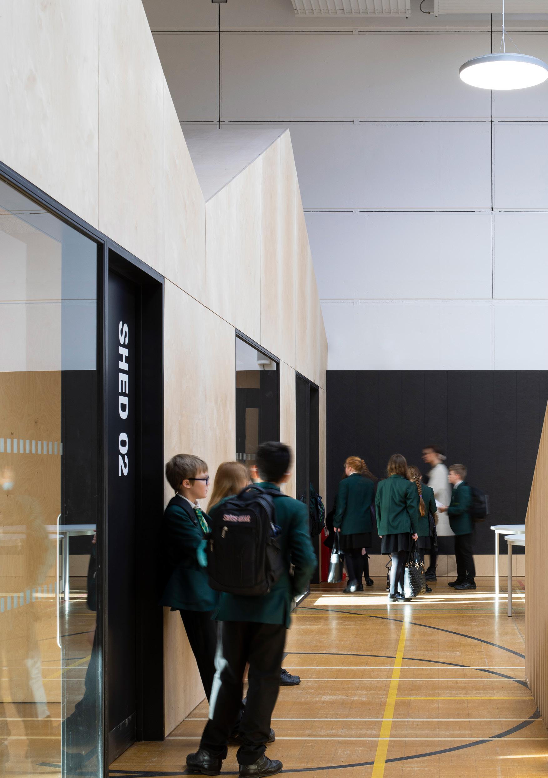 Esta imaginativa remodelación ofrece espacios de enseñanza flexibles, un estudio de tecnología de diseño y una cafetería dispuestos en torno a un espacio social de doble altura para comer, aprender de manera informal y celebrar eventos. Este espacio central está animado por los “escalones de aprendizaje”, una escalera procesional con asientos integrados que conduce a un entresuelo remodelado, que ofrece más espacio para comer y asientos para el público durante presentaciones y actuaciones.