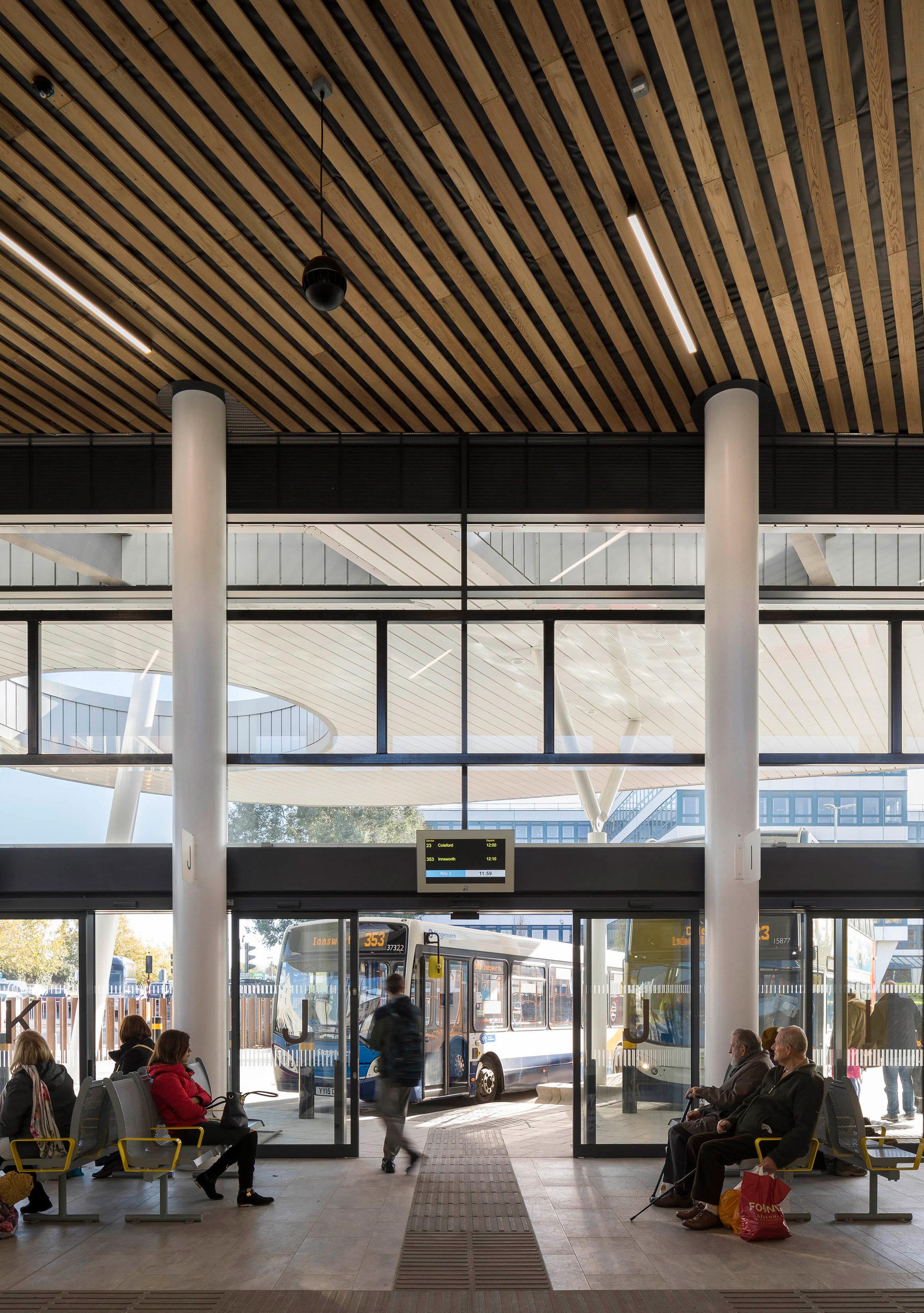 El diseño incluye paradas de autobús para 12 vehículos dispuestas en formato chevron para permitir un método de entrada y salida en sentido inverso. Una explanada pública separada por una fachada acristalada a toda altura con puertas de control automático permite el acceso a los autobuses en espera. El edificio, muy transparente, ofrece un contacto visual máximo con su entorno y un ambiente tranquilo y ventilado. Un amplio vestíbulo público permite un espacio de circulación suficiente, así como zonas de espera y asientos para los distintos puestos.