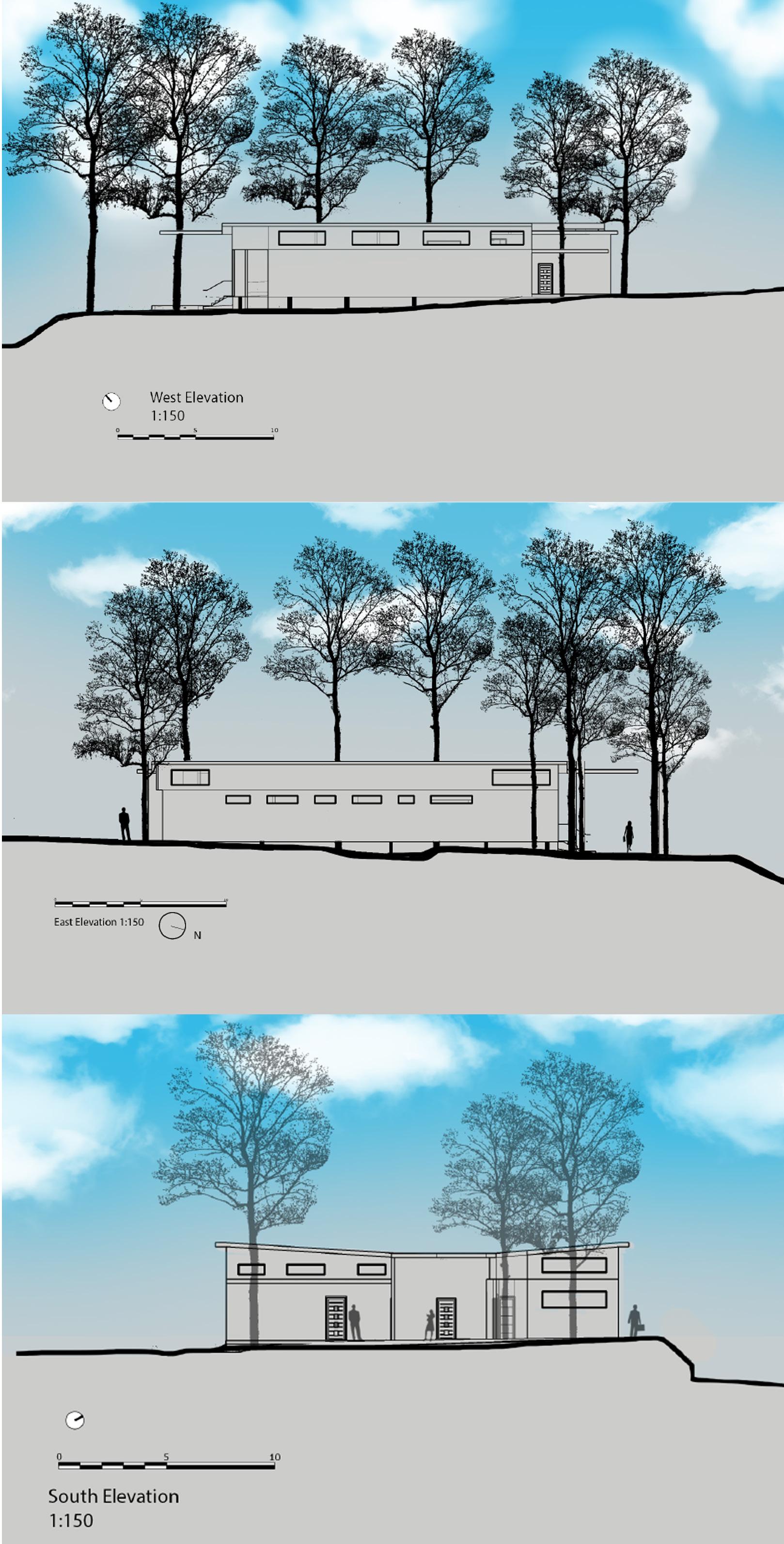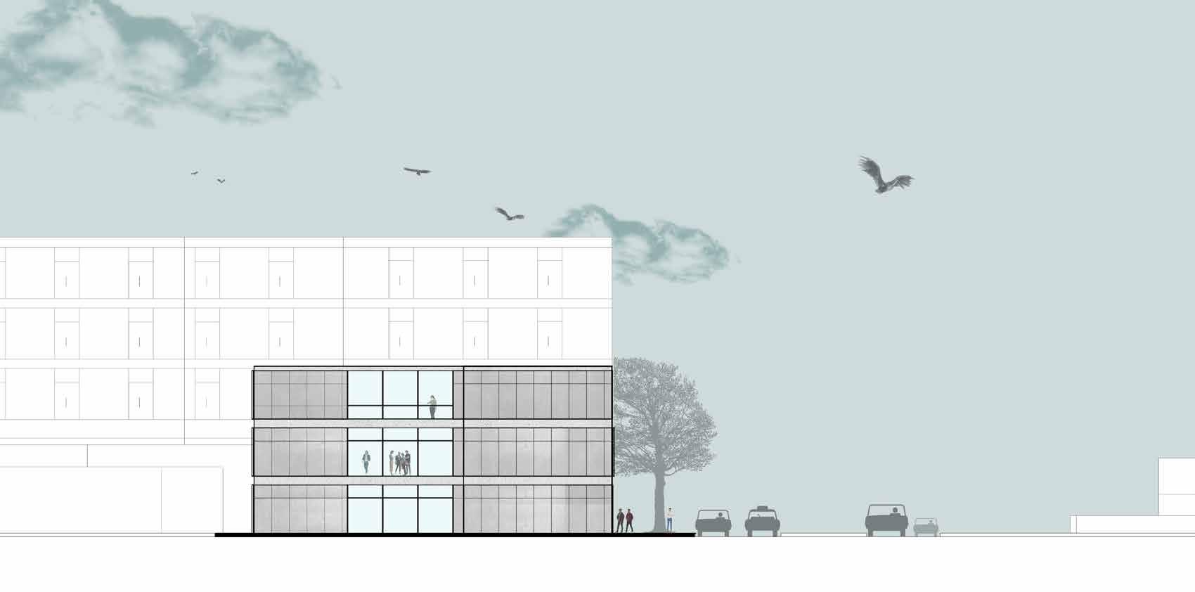 The bottom picture from the northern view shows how the trees engage the existing facade.