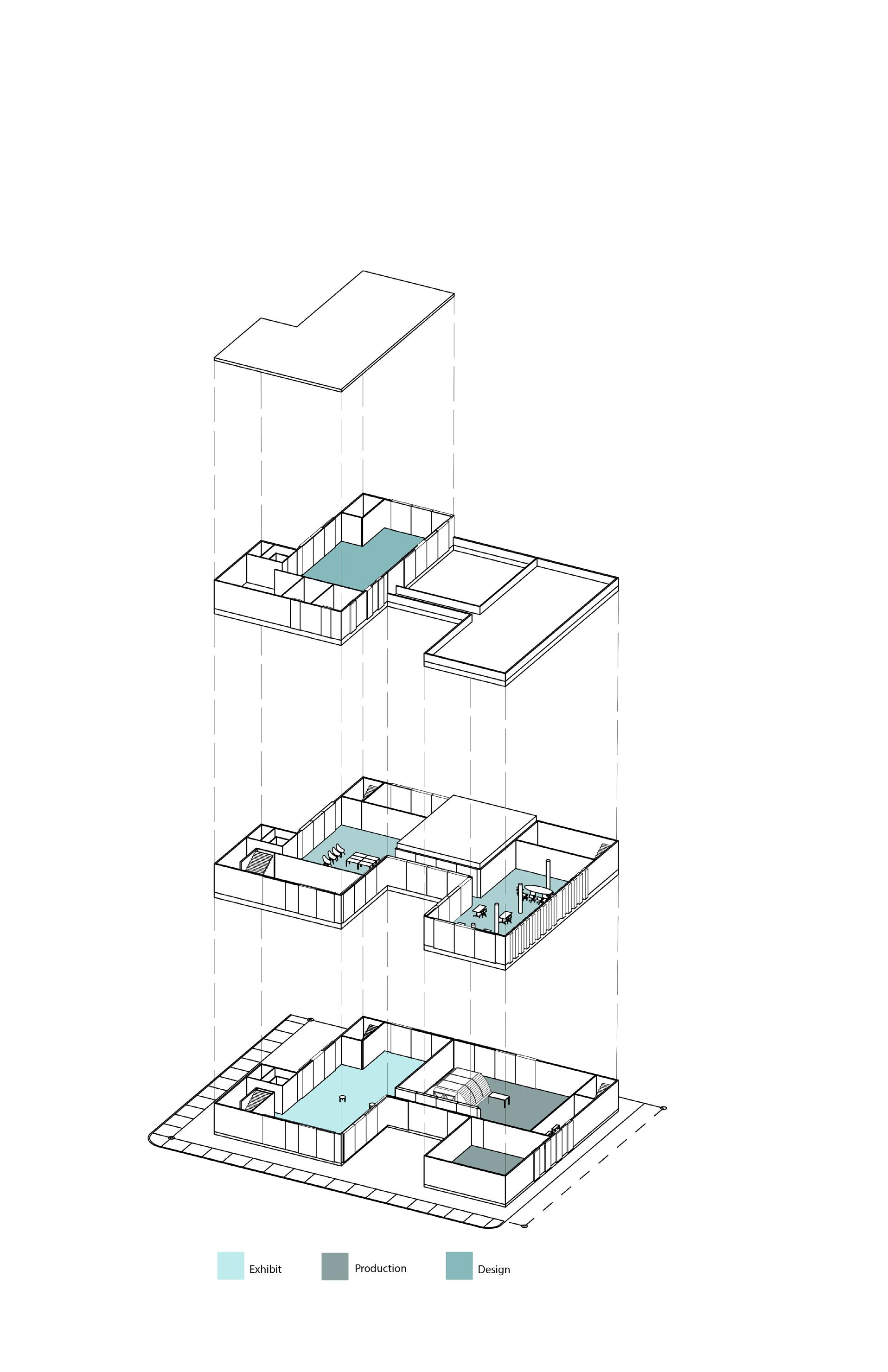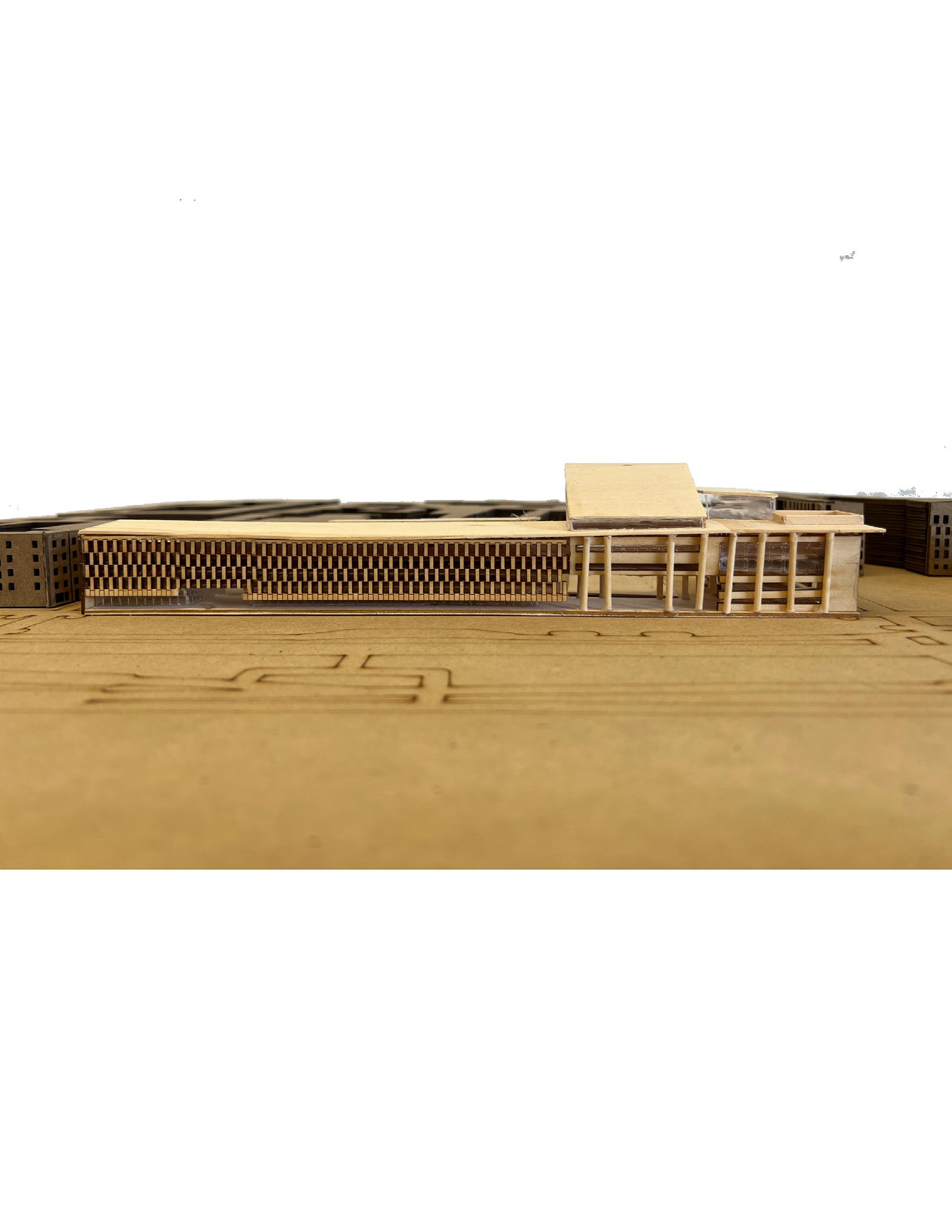 The axon showing how the scale of the site is tiny compared to the southern side, the model also shows how the over concepts space works