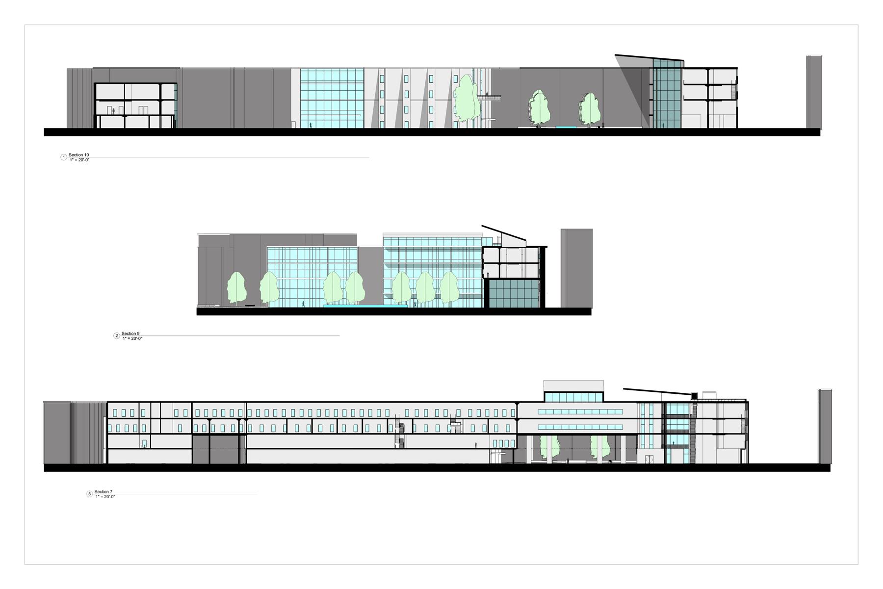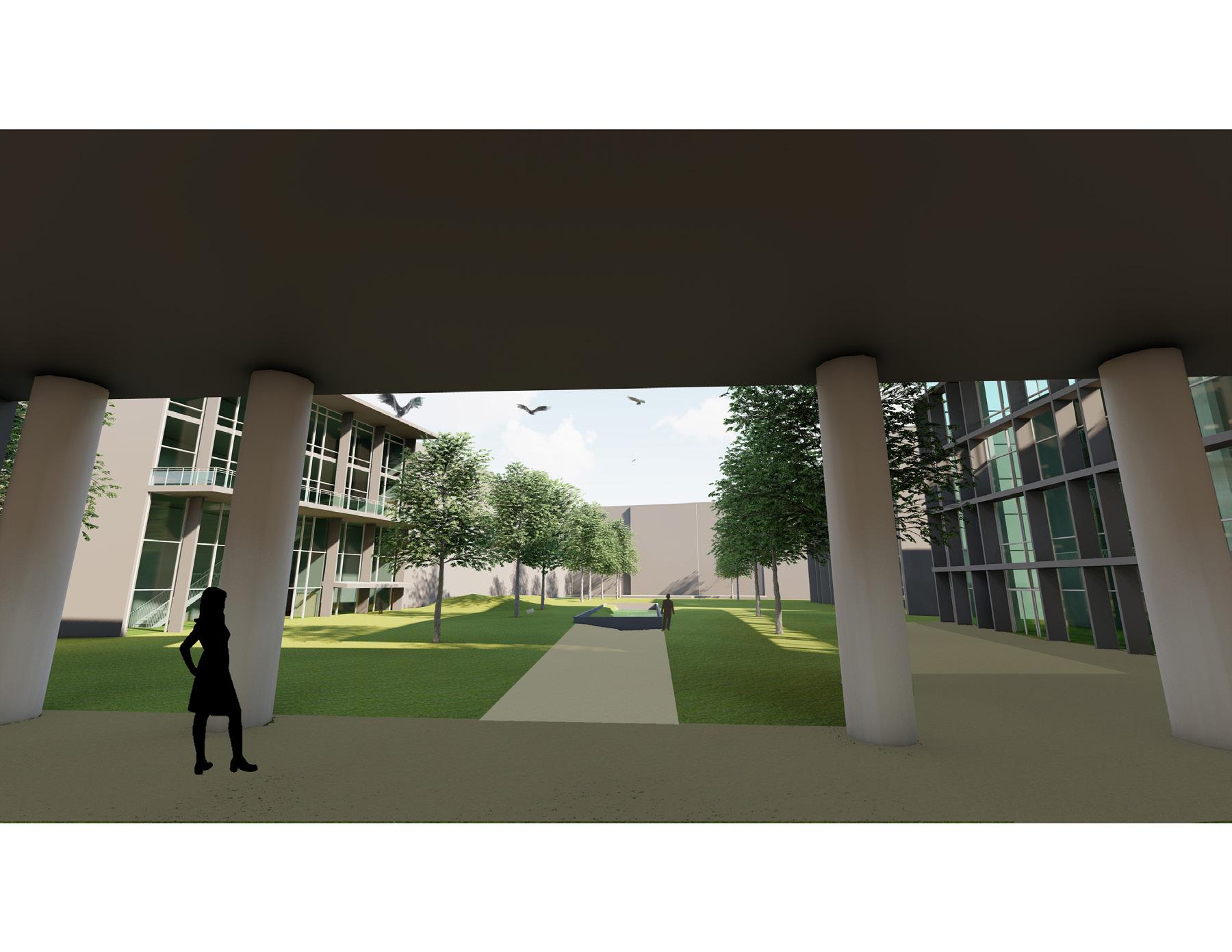 Featuring two court yards, one main public court yard with terrace seating right in front of the indoor/outdoor theatre. A brise soleil on the western facing facades to aid in sun control into the buildings.
