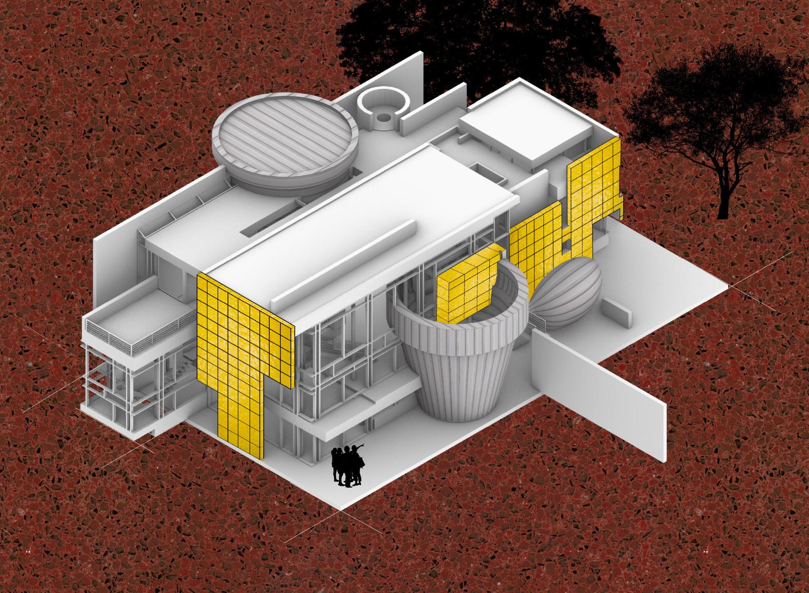 The rendering is showing the studio space where you have a glass facade looking towards the Modern Museum