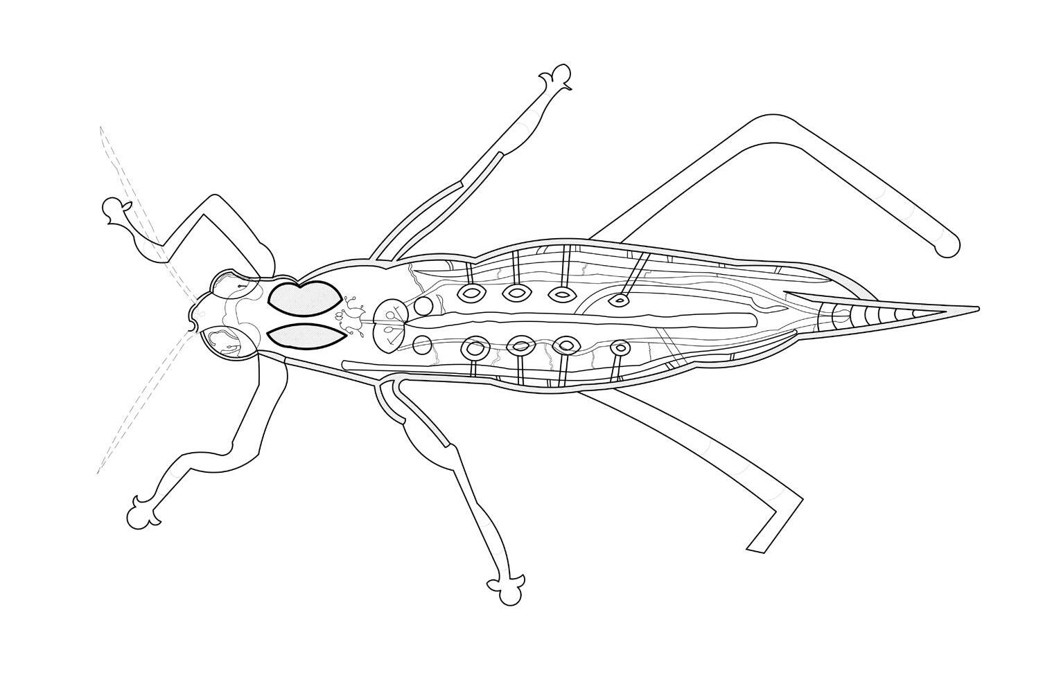 The transverse sections of the grasshopper shows how the inter weaving of the air tubes and vital organs conform to the body
