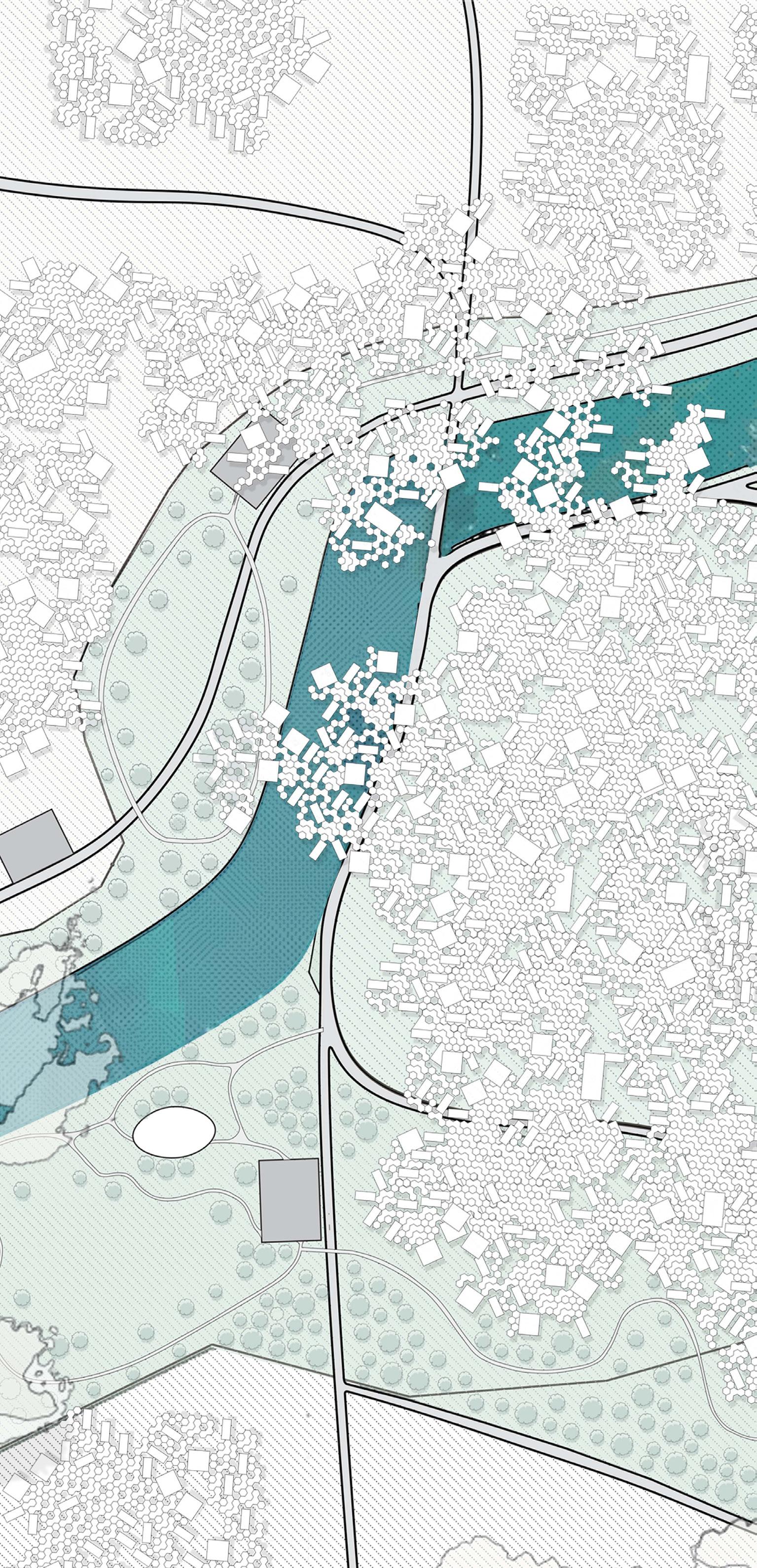 Using a parametric relationship that establishes an organized hierarchy between housing units, hydroponic farms and typical urban elements such as side walks, bridges and parks; we were able to establish a dialogue with the landscape and embed our typologies to create an urban stratagy that would reflect growth over the next 100 years
