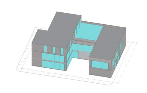 Buildings will be placed to take advantage of their solar orientation. The eastern side of the building will be a thick heat sink material featuring solid walls and the floor slabs of the living quarters. The western side is full glazing sloped to collect rainwater in an on-site tank placed under the interior garden. Early iterations will feature car ports at the front. The roof over the dwelling side of the lot will feature solar panels as an additional means of electrical resiliency.