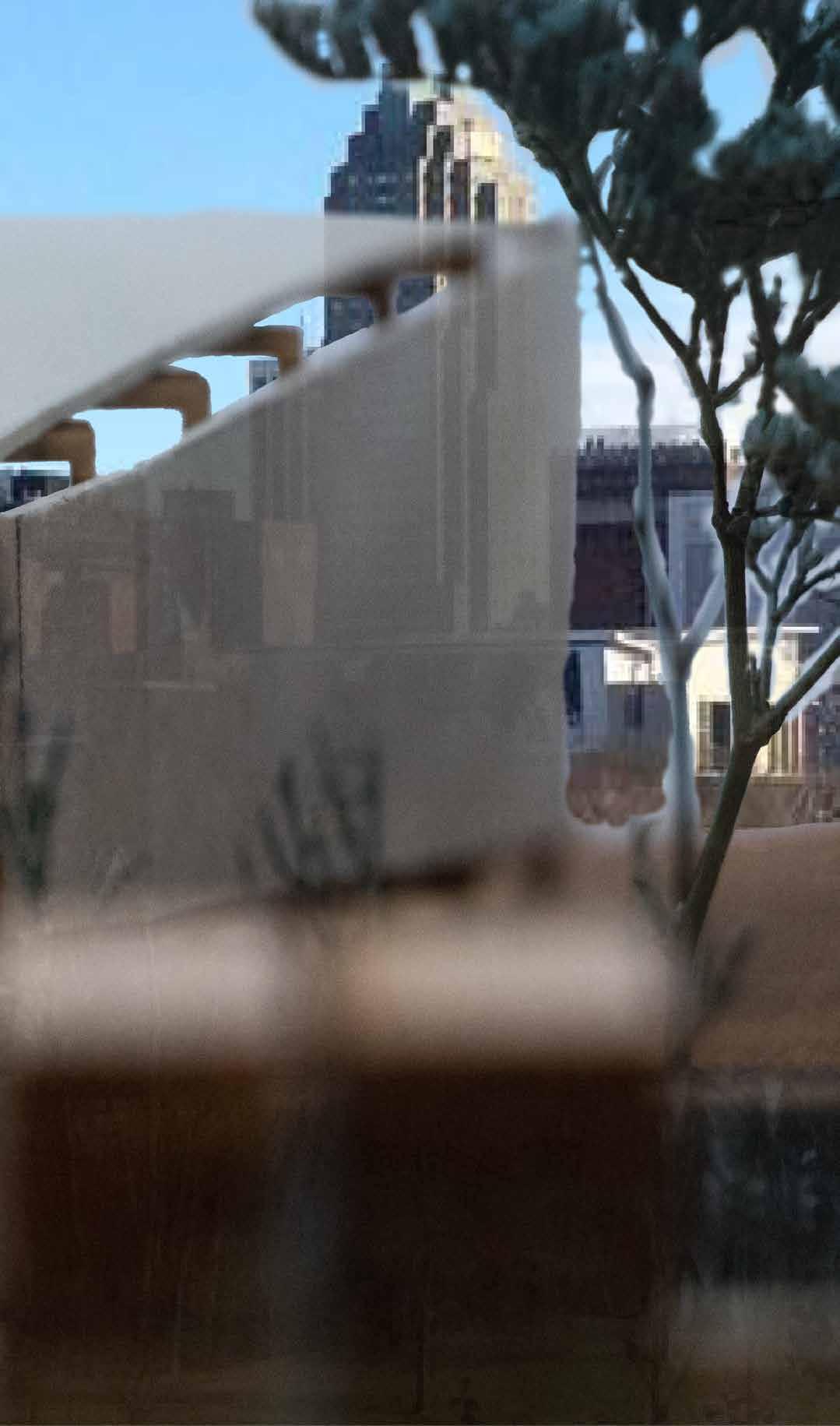 Visitors see a wall that is seemingly growing out of the ground, inviting them to explore what lies beyond. They catch glimpses of the views through gaps in the wall. The sound of music grows as you walk closer to a turn in the pathway. This turn reveals a quaint pavilion ahead, obstructed by a water garden that forces them to go around. Music is increasing in volume. The visitor sees the sky’s reflection upon the water and smells the fragrance of newly bloomed flowers. They can now clearly hear the tunes being amplified from the pavilion. One final turn fully immerses them in colorful sounds of music and the sight of Raleigh, North Carolina. 2 3 4 5 6 1