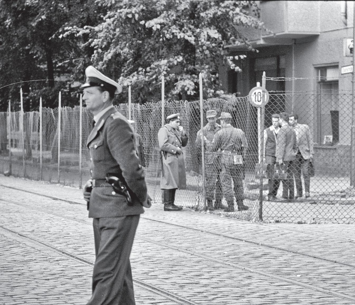An vielen Stellen, wie hier zwischen Neukölln und Treptow, ist Berlin zunächst durch Maschendrahtzäune getrennt. Vorn ein West-Berliner Polizist.