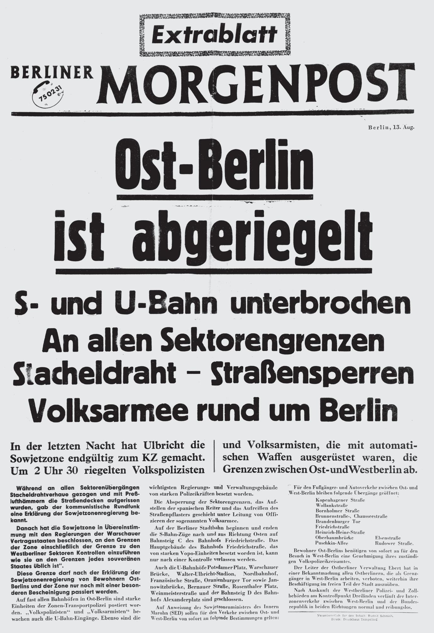 »Ost-Berlin ist abgeriegelt« – In einem »Extrablatt« berichtet die in West-Berlin erscheinende Berliner Morgenpost über die Grenzschließung.