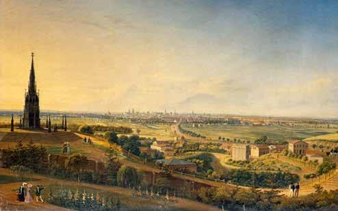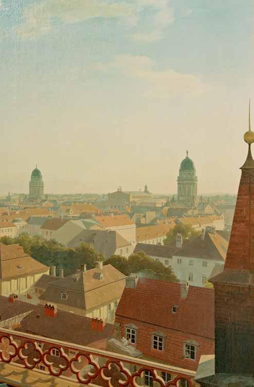 Man sieht über Hügel und Felder hinweg nach der fernen Stadt, die sich in ihrer ganzen Front und imposanten Größe ausdehnt. Trotz der doch nicht unerheblichen Entfernung sind bei gutem Wetter die zahlreichen Kirchen, vorzugsweise die Marienkirche, die Nikolaikirche, die Werder’sche Kirche, die beiden Gendarmentürme und die Petrikirche zu erkennen. Von den übrigen Gebäuden heben sich namentlich das Opernhaus und das Schauspielhaus heraus. Stolz, wenngleich ohne Zinnen, erhebt sich das kgl. Schloss mit seiner Kuppel aus dem Mittelpunkt Berlins.