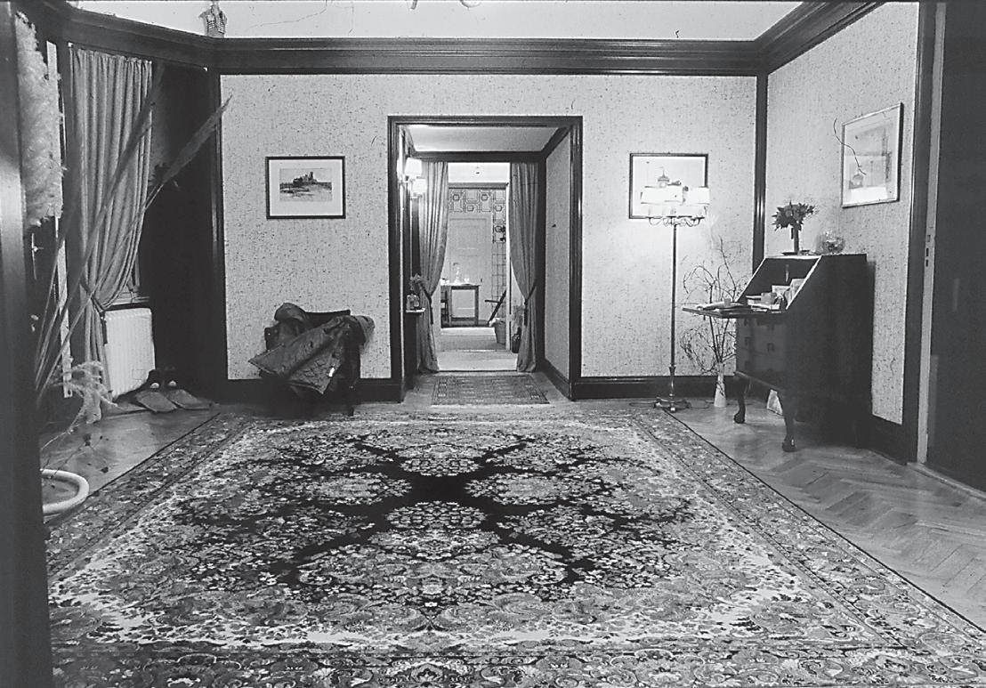 steht und ein Fernseher. 8,20 Meter mal 4,80 Meter, zuzüglich Balkon. Speisezimmer sind am Kaiserdamm meist die größten Räume der Wohnung. Öffnete man die Flügeltüren zu weiteren »Gesellschaftsräumen«, hatte man zusammengenommen 100 Quadratmeter oder mehr, um Gäste zu empfangen. Das wusste offenbar auch der Bausenator Ristock als er die Journaille zu uns einlud.