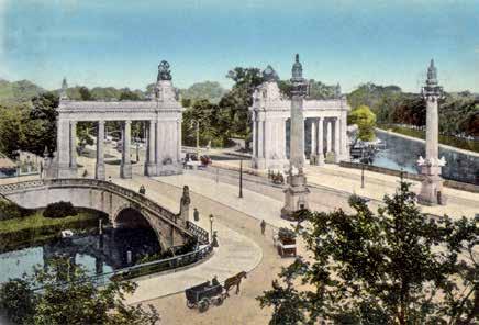 1776 stellte von Gontard solche Kolonnaden auf die neu erbaute, massive Spittelbrücke. Sie standen in Höhe des heutigen Hochhauses Leipziger Straße 48. Der Begriff »Spittel«leitet sich ab von dem 1405 gegründeten St. Gertrauden-Hospital (Hospital = Spital = Spittel), das hier viereinhalb Jahrhunderte bestanden hat. Die zwei halbrunden Kolonnaden mit den Kramläden standen beiderseits der Fahrbahn. Der südliche Teil musste 1929 im Zuge einer Verbreiterung der Leipziger Straße abgetragen und eingelagert werden. Der nördliche Teil wurde später ein Opfer des Zweiten Weltkriegs. 1980 stellte man eine Kopie des südlichen Teils wieder auf. Sie steht wenige Meter westlich vom ursprünglichen Standort auf dem Marion- GräfinDönhoff-Platz. Der vor der Kolonnade stehende Obelisk ist die Nachbildung einer Meilensäule, die seit etwa 1730 an gleicher Stelle auf dem früheren Dönhoffplatz stand. Mit den Kolonnaden hat er nichts zu tun.