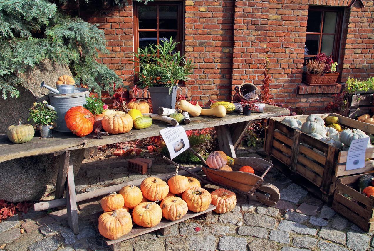 Mitten im Storchendorf Linum liegt der Hof von Sabine Schwalm und Georg Rix mann, die seit 1996 auf etwa 15 Hektar Land Speisekürbisse, Topinambur, Kar toffeln und weitere Obst- und Gemüsesorten anbauen. Im Mittelpunkt stehen allerdings die Kürbisse, von denen hier inzwischen 150 verschiedene Sorten aus der ganzen Welt wachsen. Für alle, die etwas ratlos vor der unbekannte Farbenund Formenpracht stehen, gibt es an jeder Gemüsekiste passende Rezepte: etwa für Butternutkürbis mit Hackfleischsoße, für überbackenen Hidemikürbis, für Spaghettikürbis à la Carbonara oder für saftigen Kürbiskuchen.