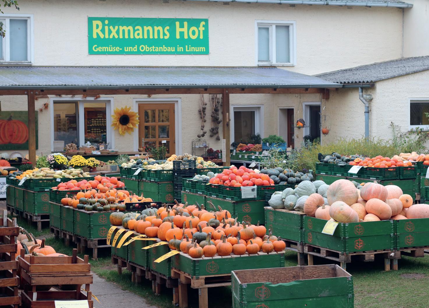 Rixmanns Hof, Nauener Straße 23a, 16833 Linum 033922-505 71 rixmannshof@gmx.de • www.gemuese-und-obst.de Ostern bis Mitte November: Freitag 12–18 Uhr, Samstag, Sonntag & feiertags 11–18 Uhr, Ende September bis Anfang November: zusätzlich Montag bis Freitag von 12–18 Uhr (aktuelle Öffnungszeiten auf der Webseite)
