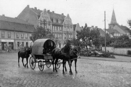 Planwagen einer ostpreußischen Sintifamilie auf der Markstraße am Kurfürstenplatz in der Kreisstadt Labiau im Jahr 1935. Im Hintergrund der Turm der Stadtkirche. In diesem Jahr beginnen die Nationalsozialsten mit der brutalen Ausgrenzung der Sinti und Roma.