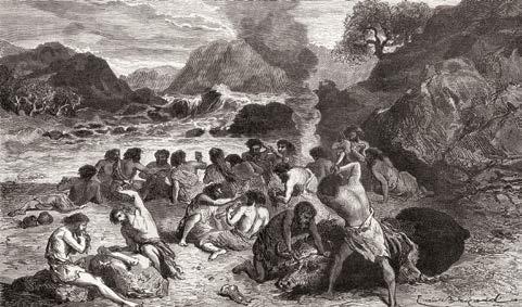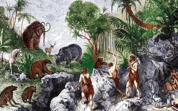 Die frühen Menschen waren Allesfresser, die sich sowohl von erlegtem Fleisch als auch von Pflanzen ernährten. Illustration aus „L‘Homme Primitif“ von 1870