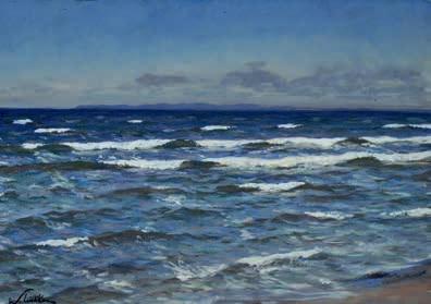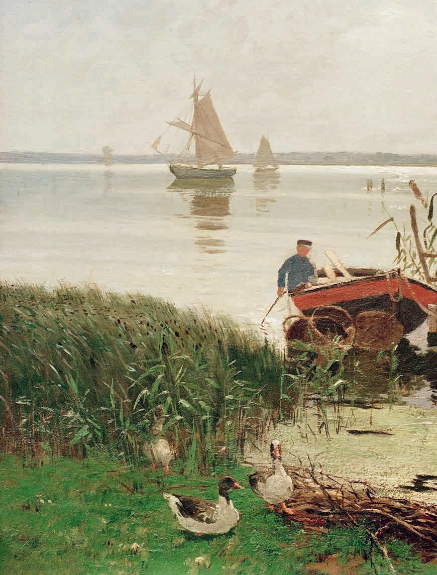 Stimmungsbildend wirkt der Kontrast zwischen Landschaft, Wasser und h immel. Die lebendige Landschaft – mit der frühlingswiese im Vordergrund, den spielenden Mädchen und dem Segelboot am Strand –begegnet einer grenzenlosen Weite von h immel und Meer und offenbart bereits das sanfte Oval, das später zu einem typischen Merkmal von Leistikows Seedarstellungen werden sollte.