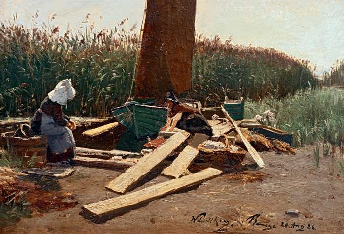 Bewegte Menschen, die arbeiten oder sich unterhalten, gehören zu den häufigsten Motiven in den frühen Bildern Leistikows.