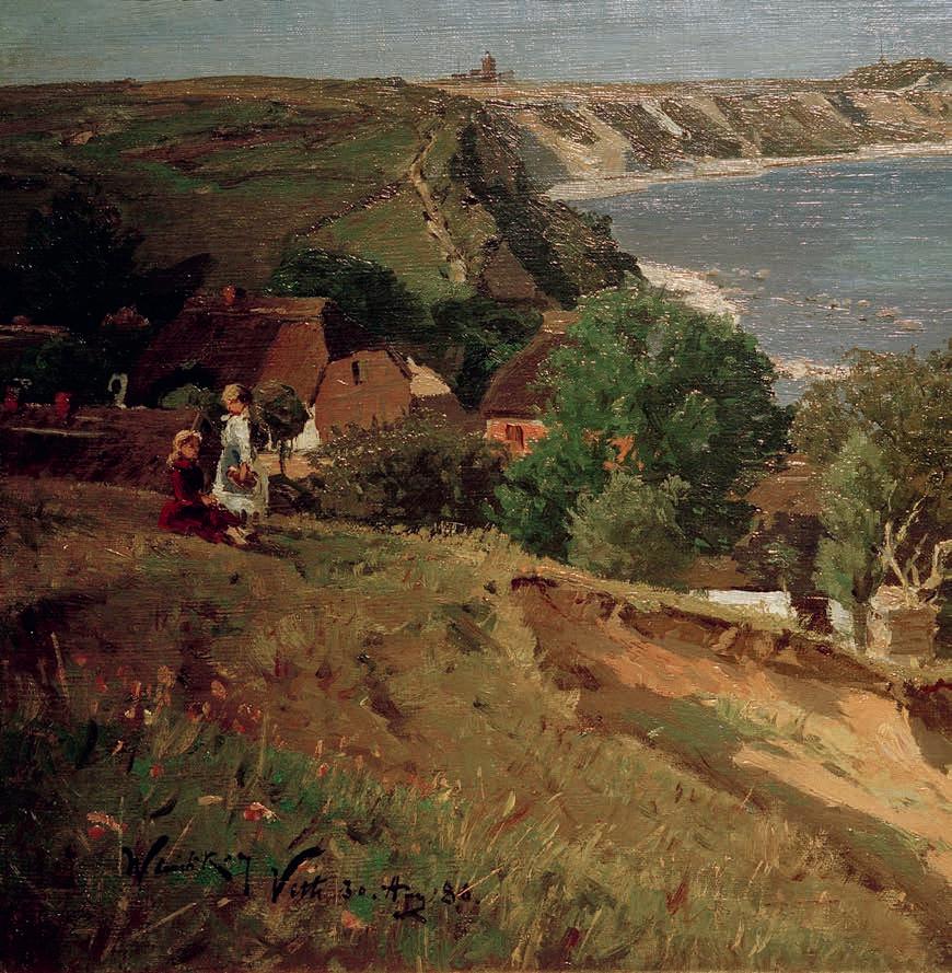Küstenlandschaft bei Vitt auf der Insel Rügen mit Blick auf Kap Arkona, 1886 Öl auf Leinwand auf Karton, 40 × 57 cm Leihgabe des Landes Nordrhein-Westfalen. Inv. Nr. 4836; Regensburg, Kunstforum Ostdeutsche galerie