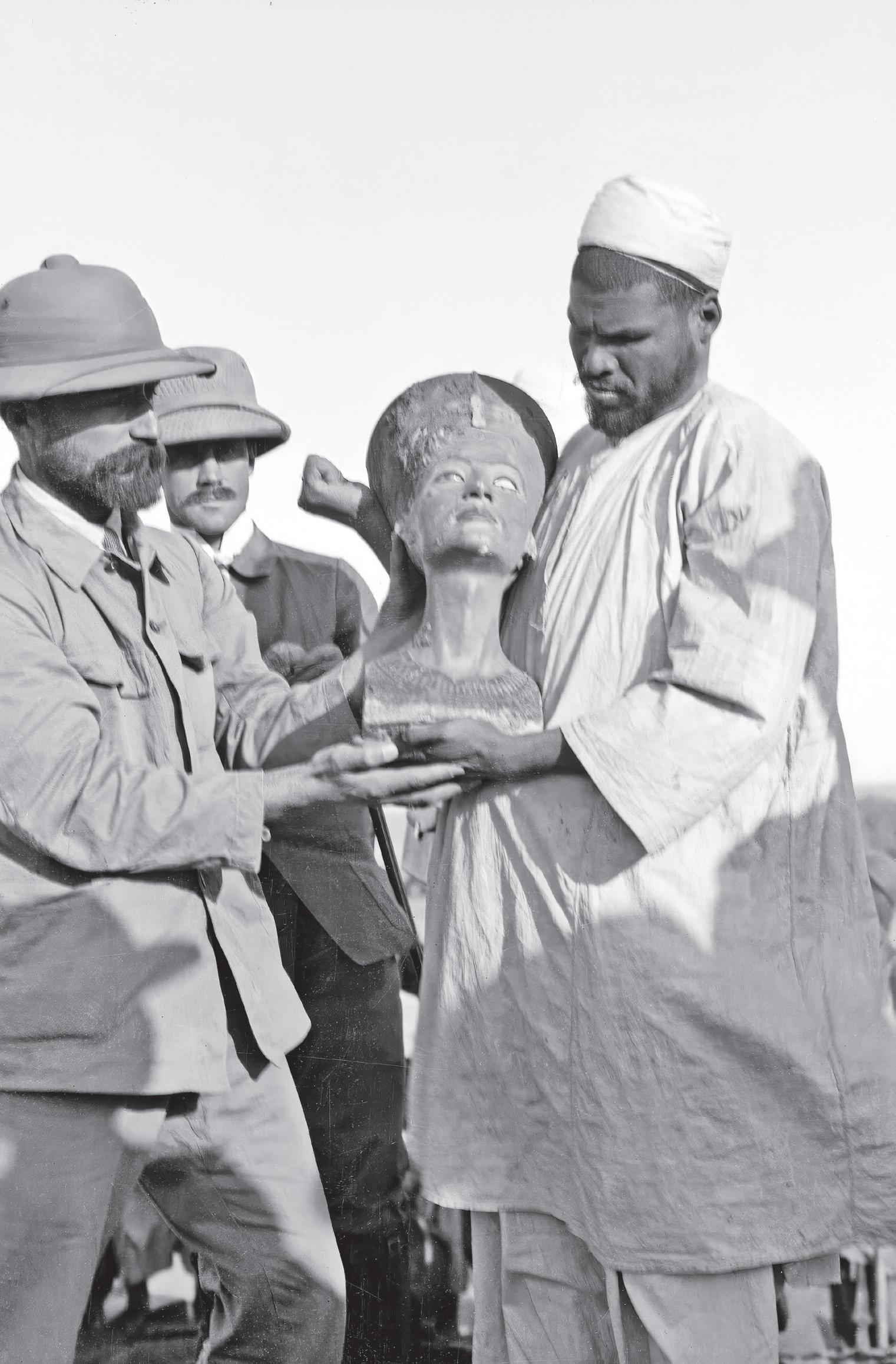 Die Werkstatt des Thutmosis hat man bei dem zerstörerischen Werk offenbar übersehen. Viele Erinnerungsstücke und so auch die berühmte Büste der Nofretete blieben erhalten, die durch Borchardts Grabungen 1912 wieder ans Tageslicht kamen. Wie es damals Praxis und in den Statuten der ägyptischen Altertumsbehörde vorgesehen war, fand am Ende der Kampagne eine vertraglich festgelegte einvernehmliche Teilung der Funde statt. Durchgeführt wurde sie von dem französischen Grabungskommissar Gustave Lefèbvre, nach dem Prinzip »à moitié exacte« –jede Seite bekommt genau die Hälfte. Nofretete gehörte zu den Objekten, die an die deutsche Seite gingen.