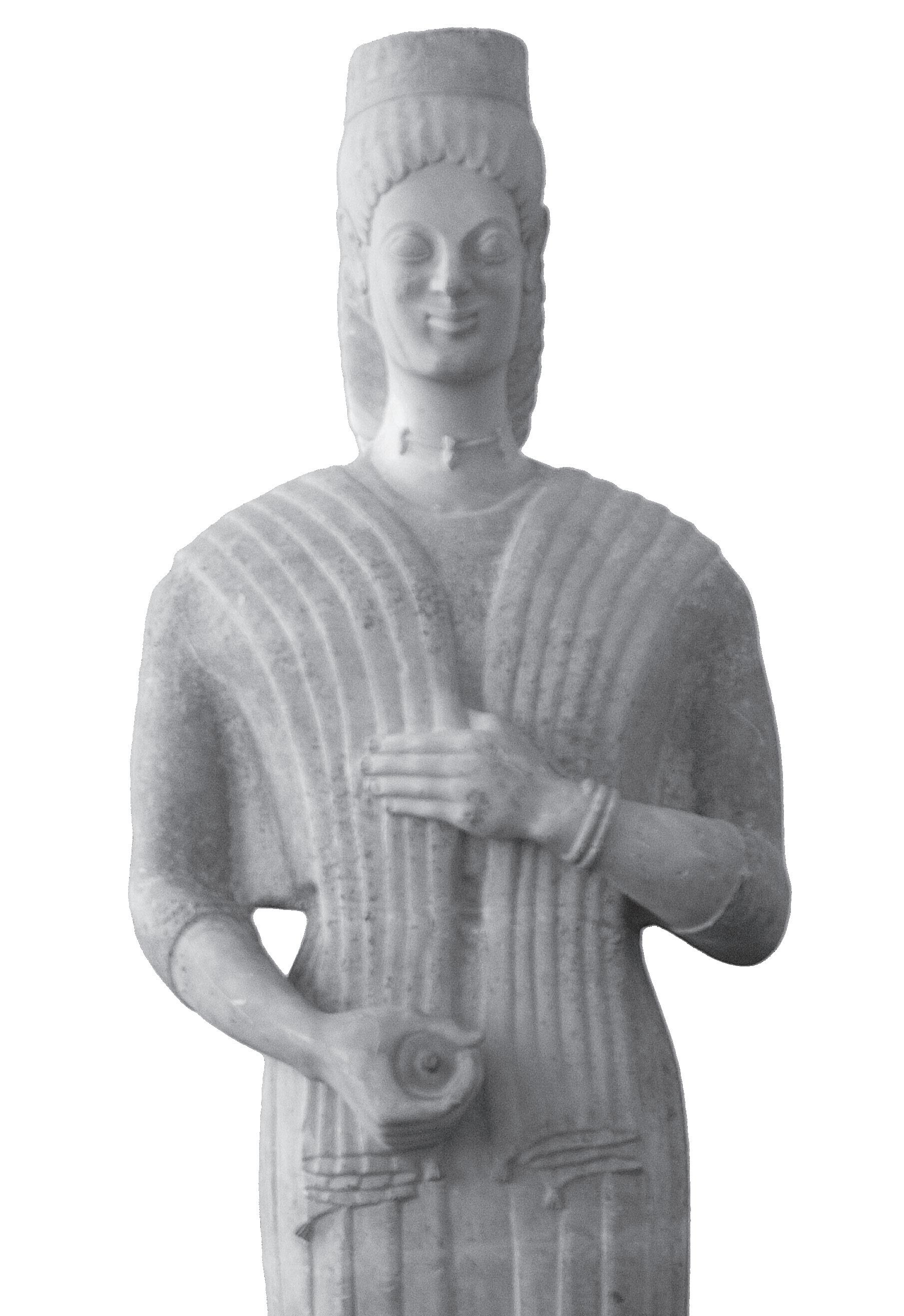 Dabei ist sie weder Berlinerin noch Göttin. Berlinerin ist sie erst seit 100 Jahren. Und dass sie keine Göttin ist, ist auch erst das Ergebnis neuerer Deutungen. Einigen kann man sich auf die Bezeichnung »Kore«, wie man in der Archäologie mit einem altgriechischen Begriff die Statue einer jungen Frau bezeichnet. Das männliche Pendant ist der »Kouros«. Beide Formen, Kore und Kouros, gehörten zum festen Repertoire antiker Bildhauer und Maler in der archaischen Phase der griechischen Geschichte, also zwischen 800 und 500 v. Chr. In diese Periode gehört auch die »Berliner Göttin«. Geschaffen wurde sie in der ersten Hälfte des 6. Jahrhunderts, wahrscheinlich um das Jahr 570 v. Chr.