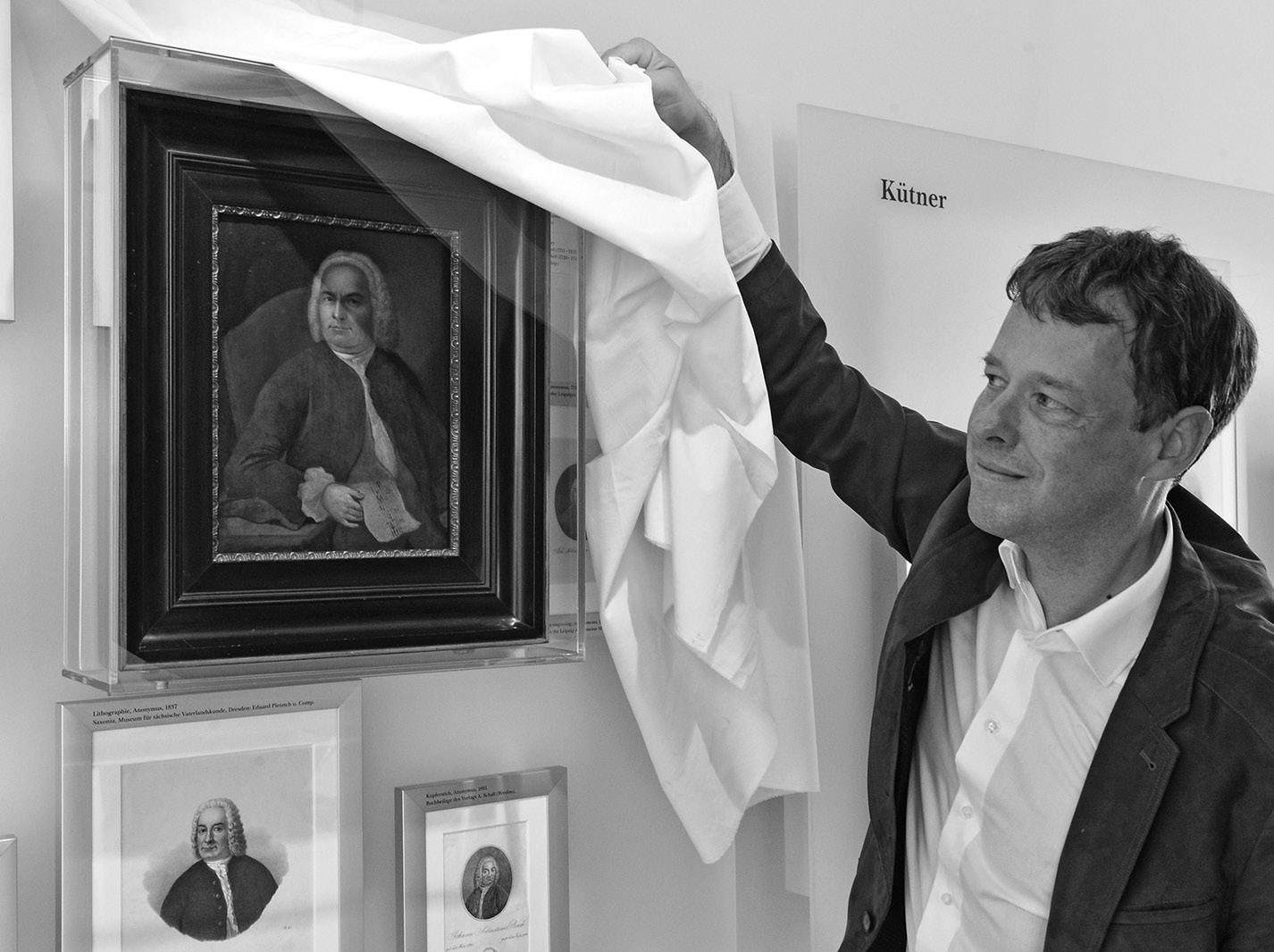 Vermutlich authentisch: Museumsleiter Jörg Hansen bei der Präsentation des Göbelschen Bach-Porträts, das 2014 zunächst als Leihgabe nach Eisenach kam.