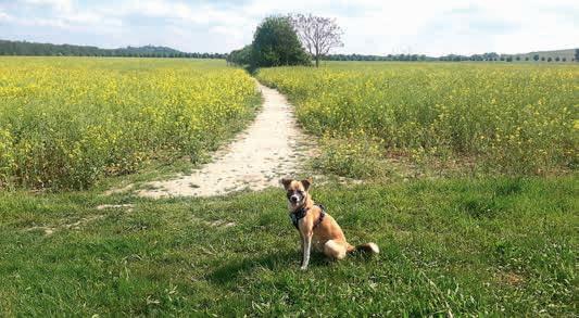 Mein Floki zum Beispiel ist ein neugieriges, knapp 13 Kilo leichtes Energiebündel, ein Mischling aus Windhund, rumänischem Streuner und Flausen. Er kam 2021 aus dem Tierschutz zu mir und war bereits als Hundekind sehr lebhaft. Bis heute bringen ihn manche Reize aus der Ruhe und er muss sich sehr konzentrieren, wenn er trotzdem brav neben mir laufen soll. Zum Ausgleich war ich deshalb immer auf der Suche nach Gassi-Ausflügen ins Grüne, die ihm und mir Spaß machen. Runden, die ihn auslasten, aber nicht überfordern. So manches Mal sind wir dafür um-