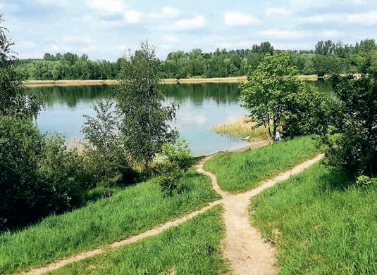 Grün, grüner, Arkenberge: Es geht an den Feuchtbiotopen der südlichen Ausläufer des Tegeler Fließ entlang über lichte Waldwanderwege Richtung Blankenfelde und dann einmal rund um die beiden Arkenseen. Dank schattiger Wege, kühlem Gras und den Seen als Highlight funktioniert diese große Runde auch an heißen Sommertagen sehr gut. Nennenswerte Steigungen gibt es nicht, denn der Arkenberg selbst befindet sich in Privatbesitz; er ist derzeit nicht offi ziell zugänglich und abgezäunt. Über die Nutzung des Geländes wird seit Jahren gestritten. Wer hätte es gedacht: Der Trümmerberg von Arkenberge ist mit 120,7 Metern Berlins höchste Erhebung. Der Teufelsberg muss sich dem Arkenberg ganz knapp um 60 Zentimeter geschlagen geben. Ohne Aufstieg auf