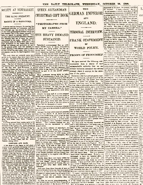 Der größte Skandal der Kaiserzeit, der diese Konflikte noch einmal in aller Schärfe hervortreten ließ, war ein Interview, das Wilhelm II. der englischen Tageszeitung Daily Telegraph gegeben hatte und das mit Erscheinen am 28. Oktober 1908 im Inland ein verheerendes Echo auslöste. Ohne hier in die Details zu gehen, war das Interview gespickt mit politisch ungeschickten Äußerungen zum deutsch-englischen Verhältnis. So behauptete der Kaiser unter anderem, dass er in Deutschland mit seiner englandfreundlichen Einstellung in der Minderheit sei.