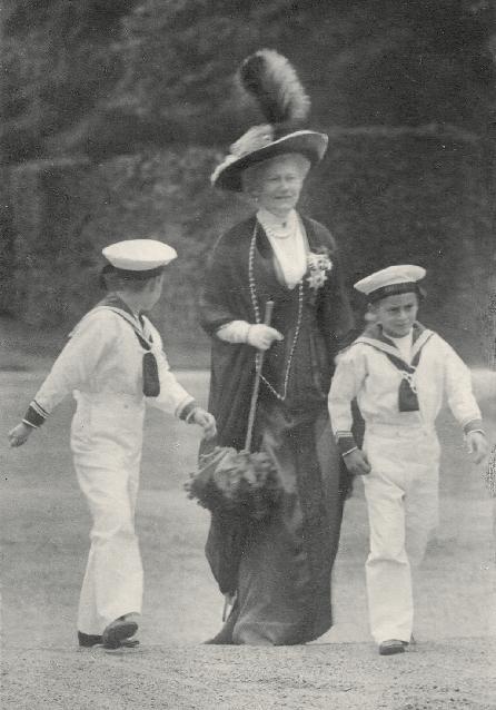 Kaiserin Auguste Victoria mit ihren beiden ältesten Enkelsöhnen Wilhelm (links) und Louis Ferdinand, 1914. Ihr besonderer Liebling war Wilhelm, da er zurückhaltend und freundlich war und sie mit seiner Person die Zukunft der Monarchie verband.