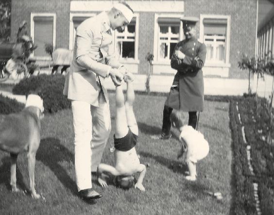 Die Kronprinzessin hält das Toben und Spielen ihrer Söhne mit der Kamera fest. In Aktion tritt der Kronprinz (in heller Uniform) sowie zur Unterstützung der militärische Erzieher der Prinzen. Die Aufnahmen auf der Gartenseite des Marmorpalais entstanden im Sommer 1911, wenige Wochen vor der Übersiedlung der Familie in das westpreußische Danzig-Langfuhr.