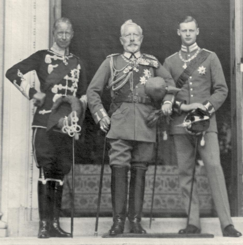 Drei Hohenzollern-Generationen: Ex-Kaiser Wilhelm II. (Mitte) mit seinem Sohn, dem ehemaligen Kronprinzen Wilhelm (links), und seinem Enkel Wilhelm. Die Aufnahme entstand, nachdem der Kaiserenkel Wilhelm am 4. Juli 1927, dem Tag seines 21. Geburtstages, das Hausgesetz seiner Familie in Huis Doorn unterzeichnet hatte.