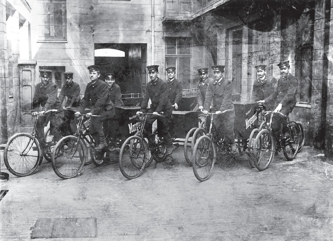 Zeitungsboten der Berliner Morgenpost mit ihren Fahrrädern, um 1900.