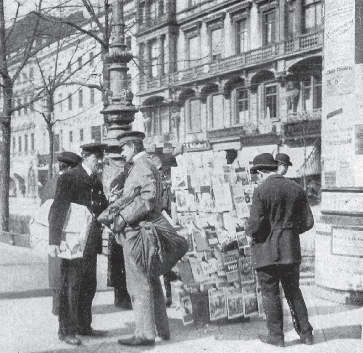 Zur Bestimmung einer Medienmetropole sind enger gefasste Medienbegriffe zweckmäßiger. Sie nehmen die Summe der »modernen« Massenmedien und die technischen Mittel in den Blick, durch die Meinungen und Inhalte theoretisch ein unbegrenztes Publikum erreichen können.7 Dabei ist nicht entscheidend, ob etwa eine Zeitung (oder ein anderes Medium) tatsächlich universell verbreitet wird – es geht vielmehr darum, dass die technischen Vervielfältigungsmöglichkeiten zeitgenössisch bereits nahezu grenzenlos sind. Im letzten Viertel des 19. Jahrhunderts und zu Beginn des 20. Jahrhunderts meinte dies in erster Linie alle Druckerzeugnisse: Bücher, Massenpresse, Postkarten, Plakate, aber auch Fotografien. Hinzu kamen die Phono- und die Filmindustrie, die ihrerseits technisch basiert immer größere Kundenkreise erreichten. Allen Medien gemein ist Folgendes: Sie »vermitteln, schaffen und speichern Informationen und beeinflussen so Wahrnehmun-